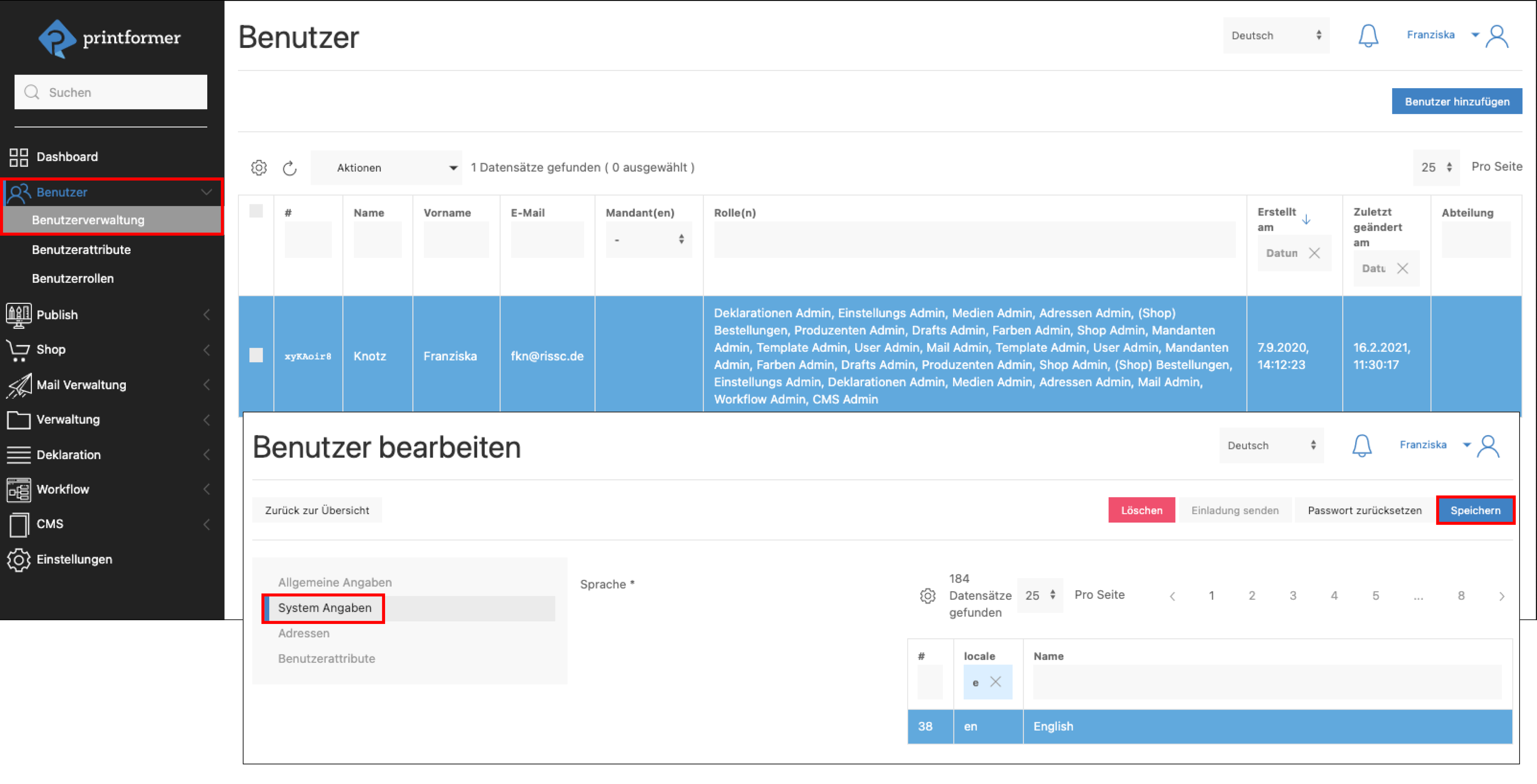 In der Benutzerverwaltung kann für jeden Benutzer die Sprache individuell eingestellt werden (Benutzer > Benutzerverwaltung > Benutzer auswählen > System Angaben).