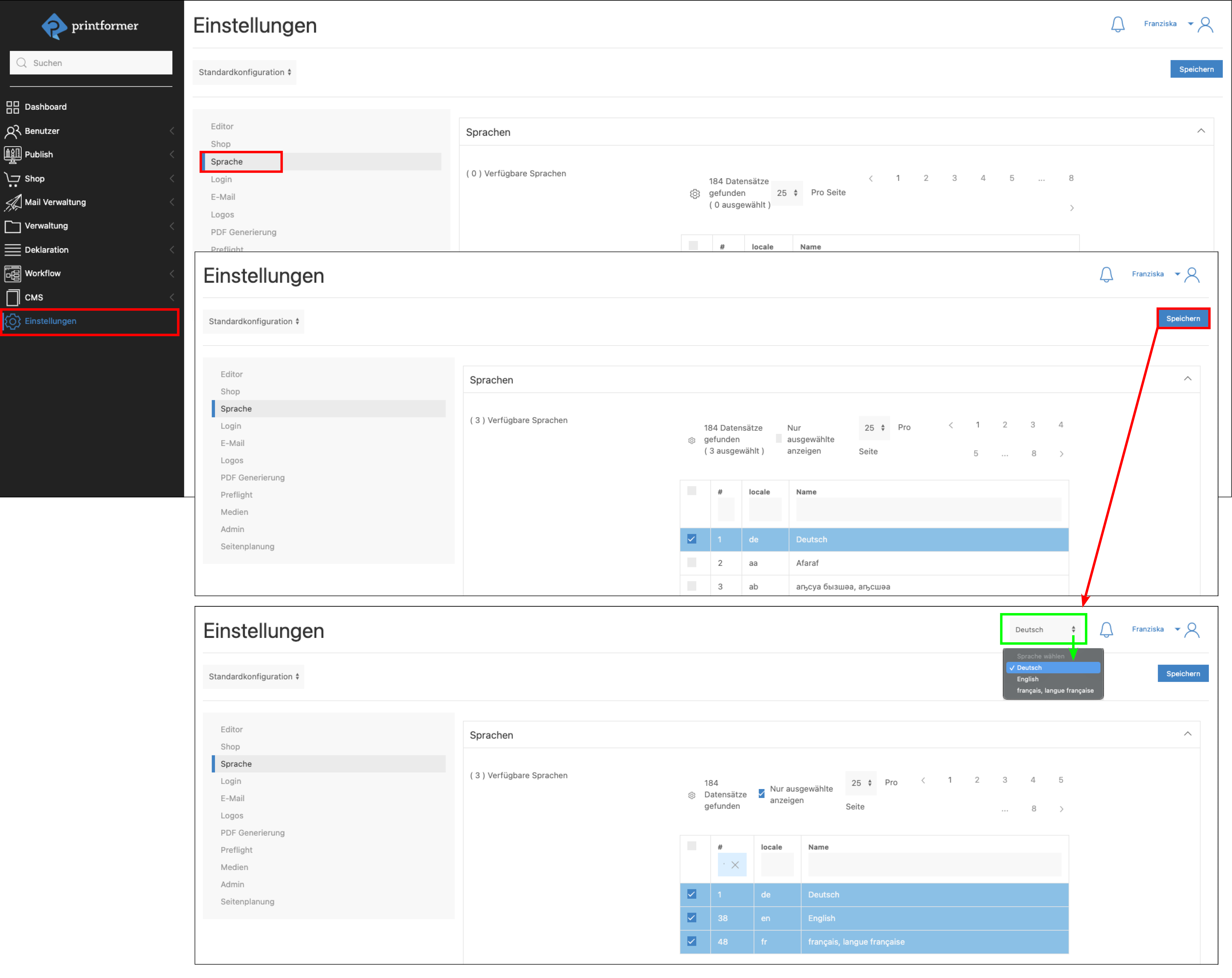 Unter Einstellungen > Sprache wird zunächst eingestellt welche Sprache/n dem System zur Verfügung stehen sollen. (Die entsprechenden Sprachdateien (Übersetzungen) dazu können bereits vorab oder nachträglich hochgeladen werden.)