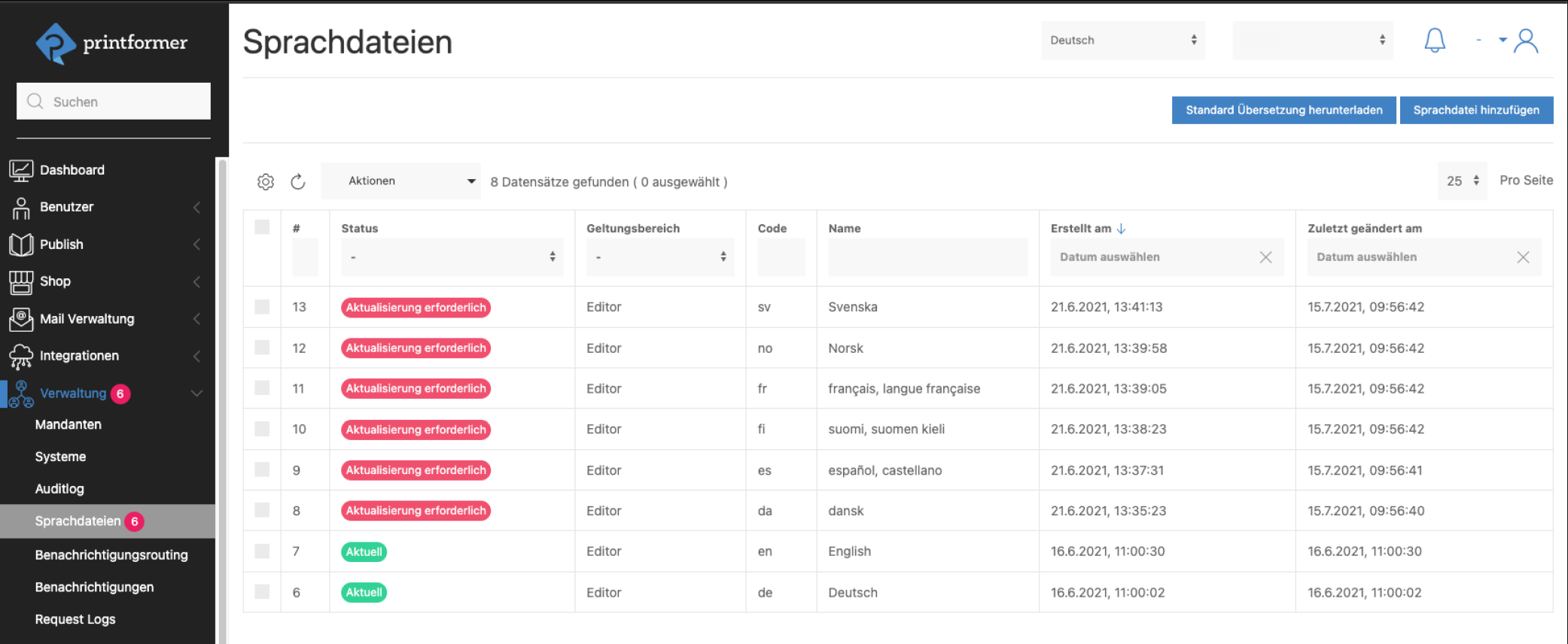 In der Verwaltung unter Sprachdateien können individuelle Anpassungen des Wordings für den printformer sowie eine Übersetzung des Admin- oder Editor-Bereichs vorgenommen werden.