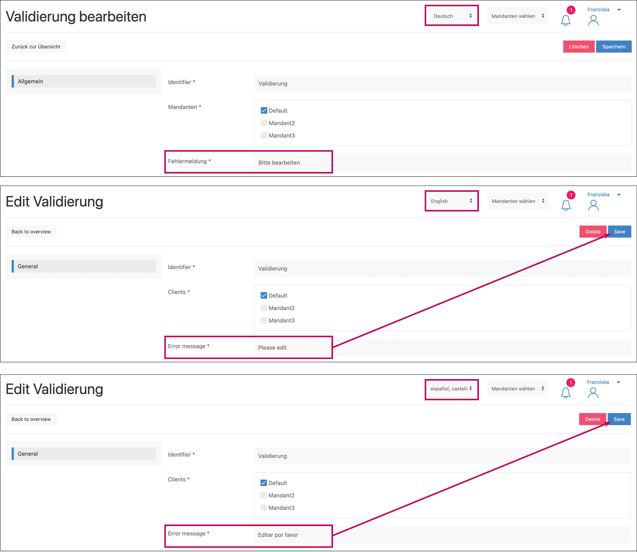 Für weitere Sprachadaptionen wird jeweils über den Sprachwähler eine Sprache ausgewählt, die Texteingabe mit der entsprechenden Sprache überschrieben und dann gespeichert: