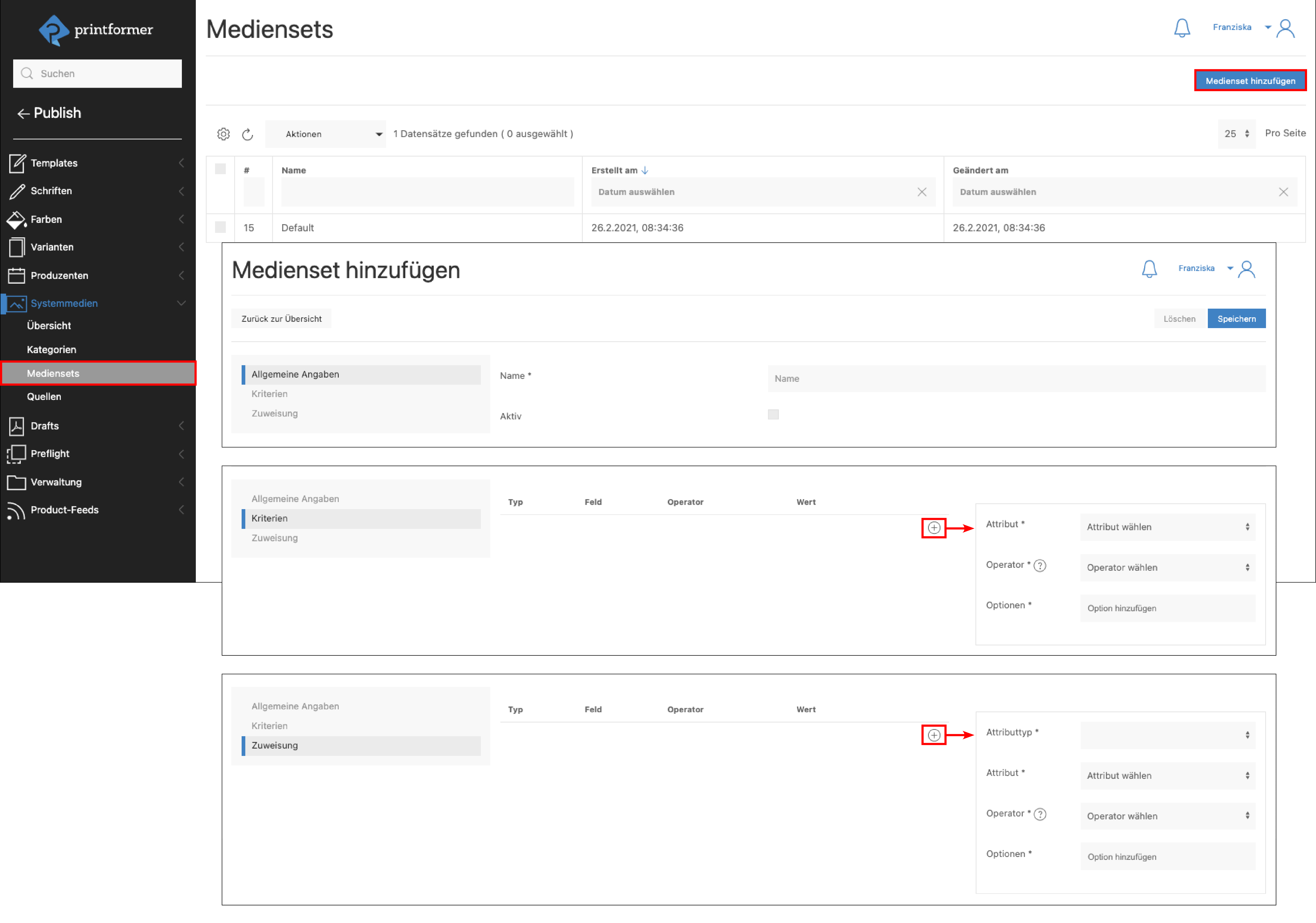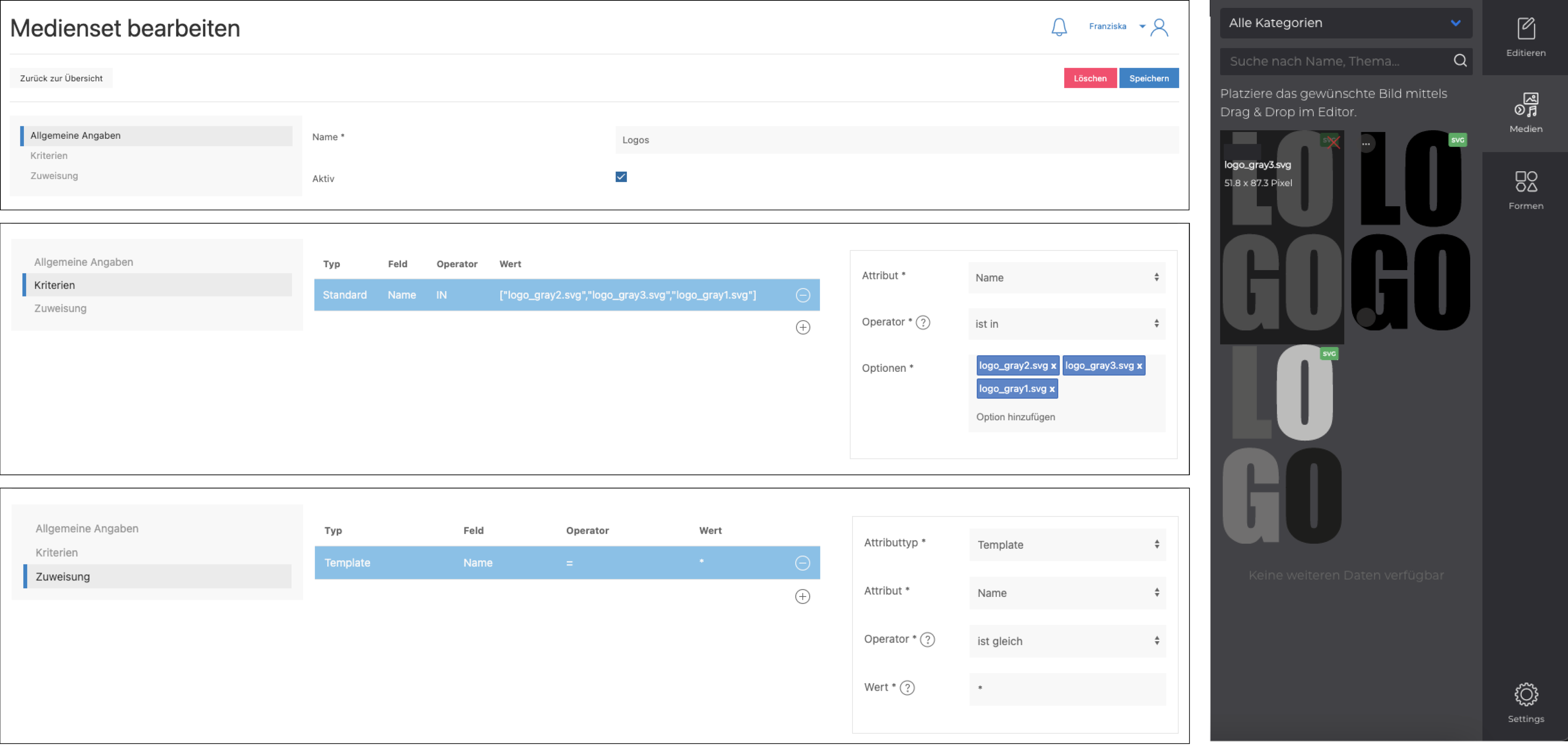 Im Menü Kriterien wird durch ein oder mehrere Attribut(e) festgelegt was (welche Dateien, die alle diese Attribute erfüllen) das Set beinhalten soll, bei Zuweisung für wen (bspw. Benutzer, Template Identifier) das Set verfügbar ist. Es können beliebig viele Kriterien oder Zuweisungen hinzugefügt werden, um Inhalt und Zugriff des Sets zu definieren.