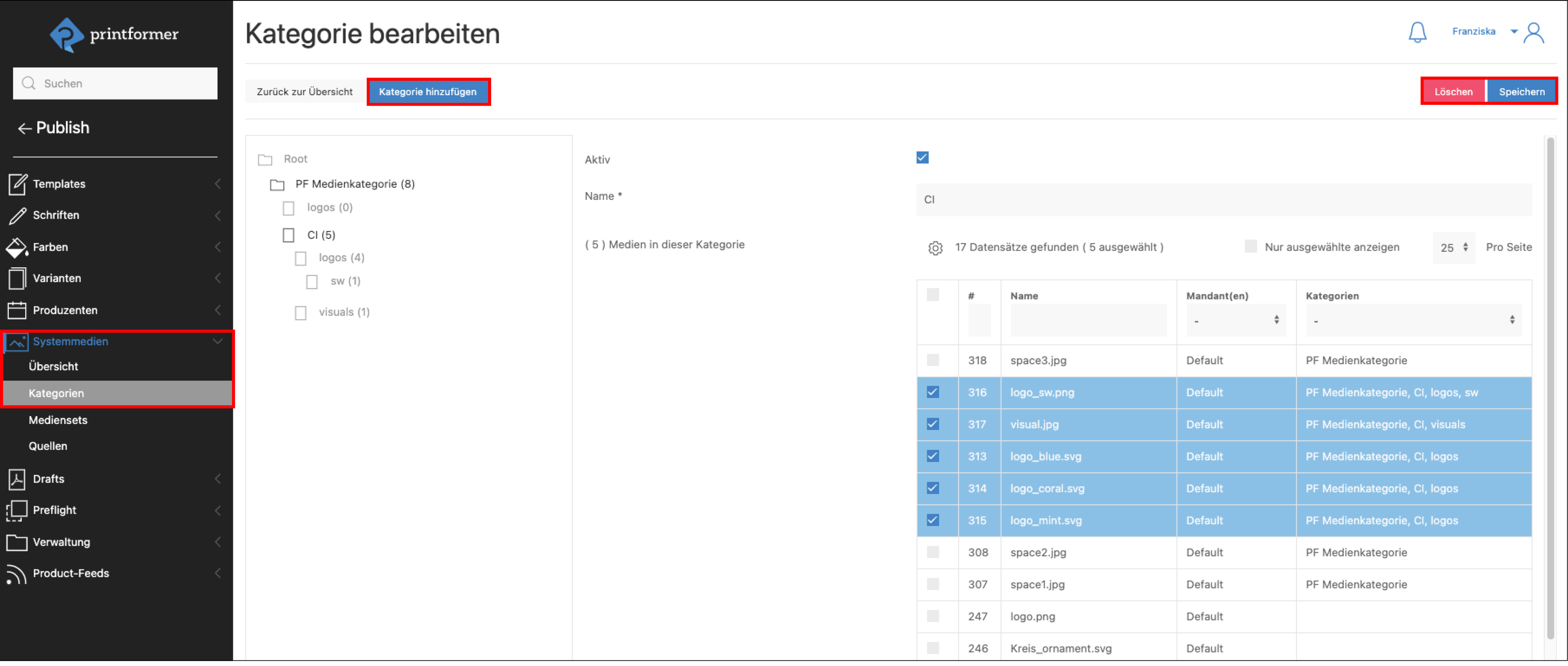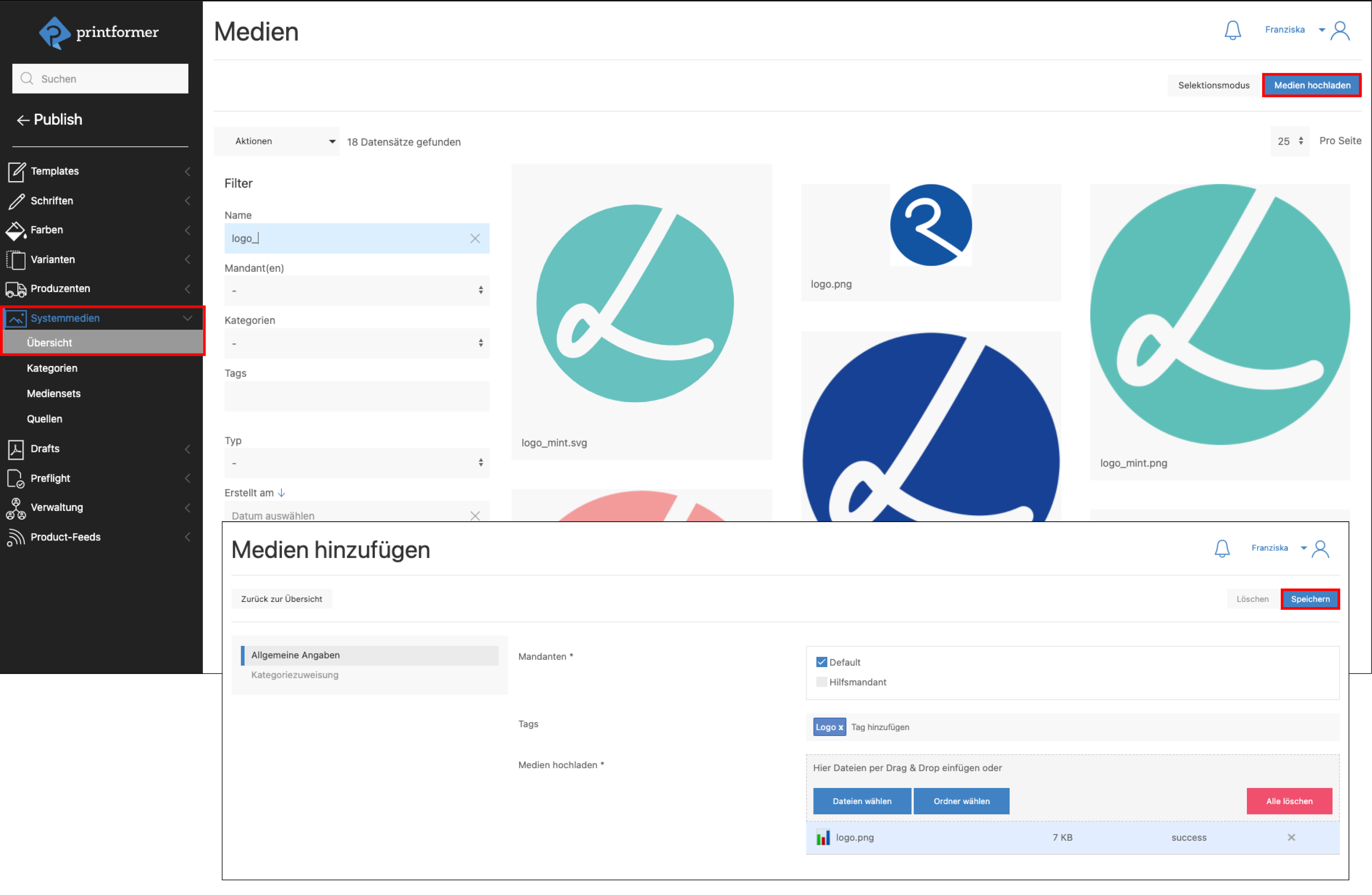 Unter dem Menüpunkt Systemmedien findet die Verwaltung von Mediendateien (mögliche Dateiformate: png, jpg, eps, tif, pdf, svg) statt.