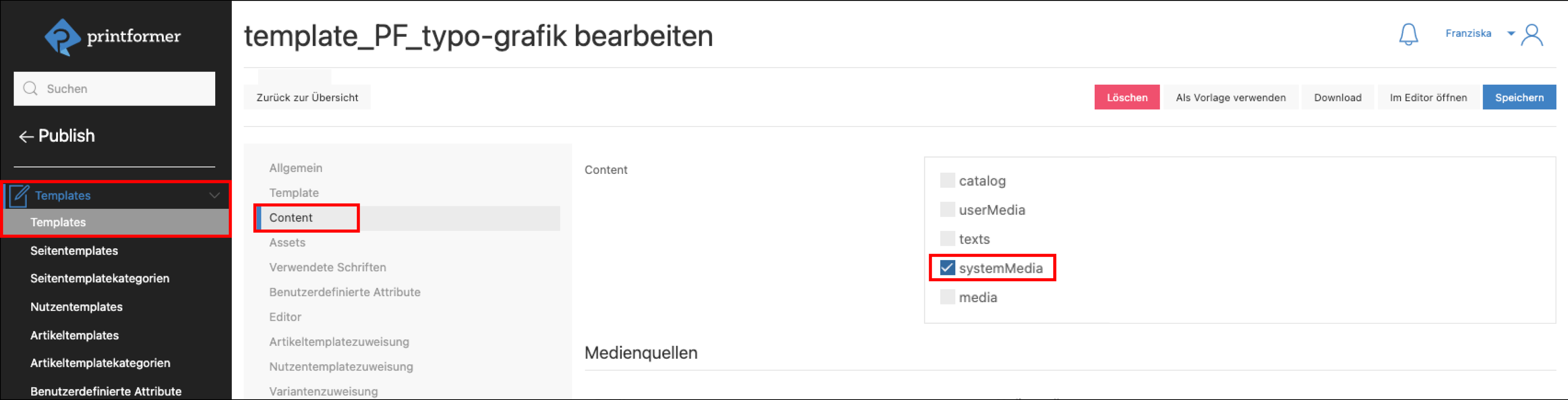 Um die Systemmedien dem User im Editor zur Verfügung zu stellen, muss zunächst das Template entsprechend konfiguriert werden: Damit das Menü Systemmedien im Editor vorhanden ist, wird unter Content die Checkbox systemMedia aktiviert. (Dabei ist zu beachten, dass damit alle vorhandenen Mediensets aktiviert werden, je nach deren vorgegebenen Kritierien werden dann die Medien im Template angezeigt oder nicht)