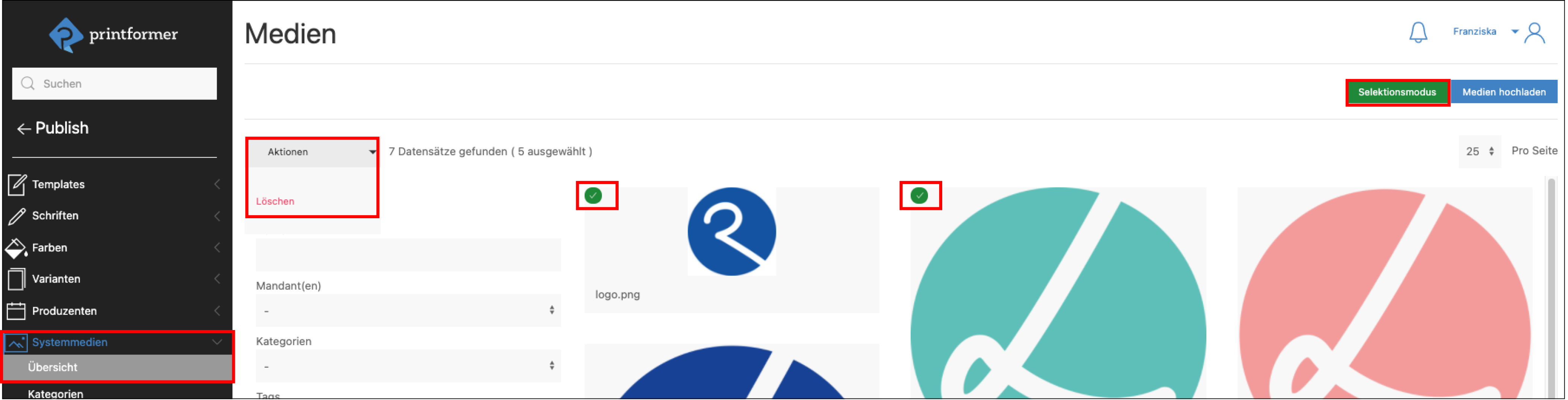 Über den Button Selektionsmodus können einzelne Dateien durch anklicken ausgewählt und (über den das Drop-down Aktionen) gelöscht werden.