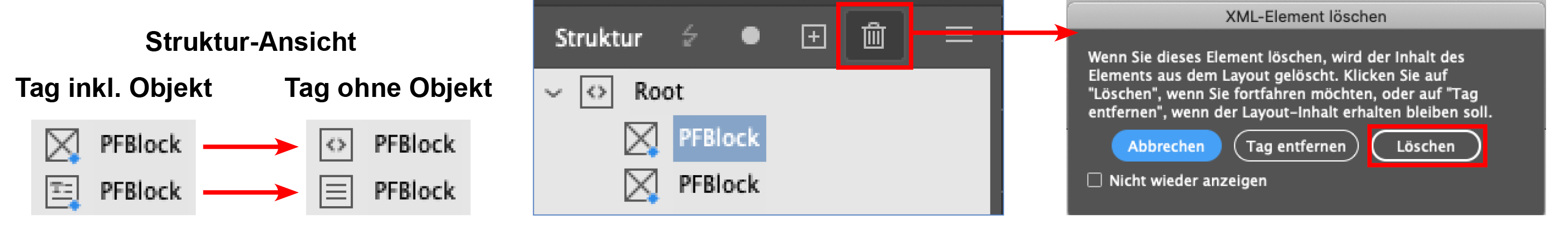Werden getaggte Objekte (Grafik-, Textrahmen, Formen) im InDesign gelöscht bleibt der Tag in der Struktur bestehen (sichtbar nur durch die Veränderung des Symbols). Über die Funktion »Löschen« im Struktur-Fenster (Mülleimer) können Tag und Layout-Inhalt auf einmal gelöscht werden.