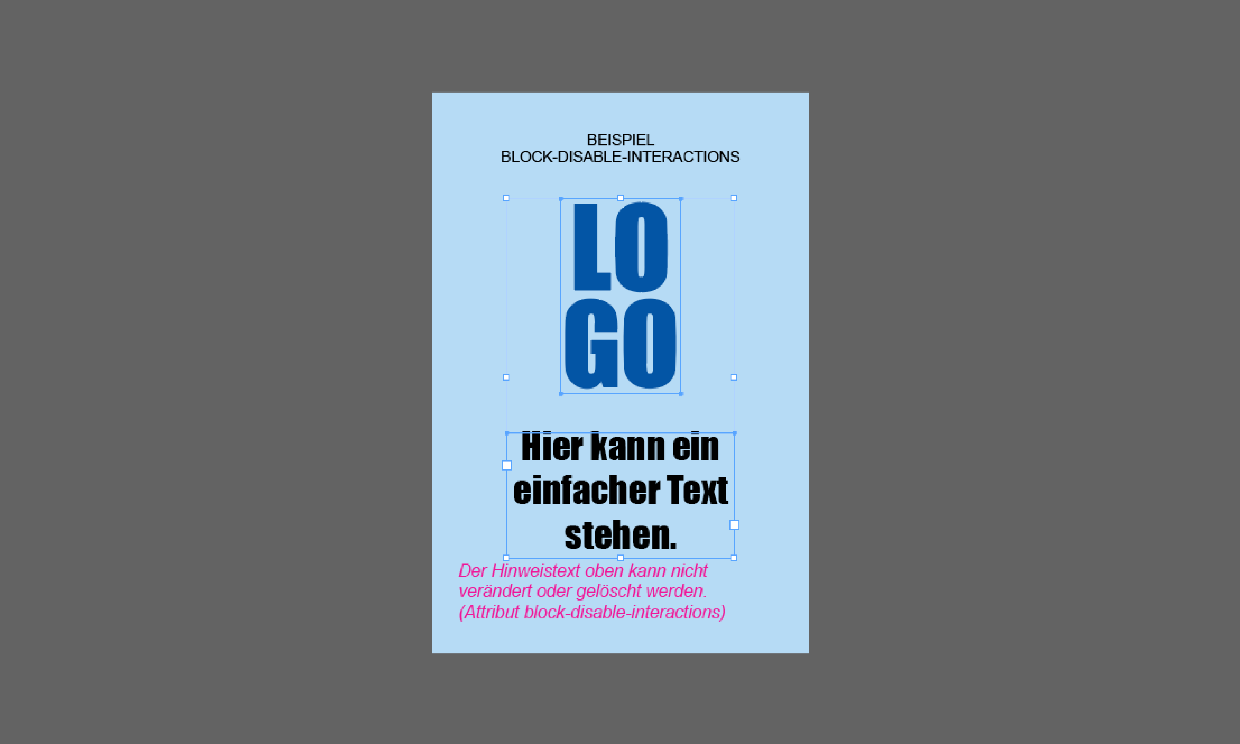 Auch sichtbare Elemente (oberhalb der Hintergrund-Ebene), die nicht editiert werden dürfen, müssen getaggt und mit einem entsprechenden Attribut (block-disable-interactions) versehen werden.