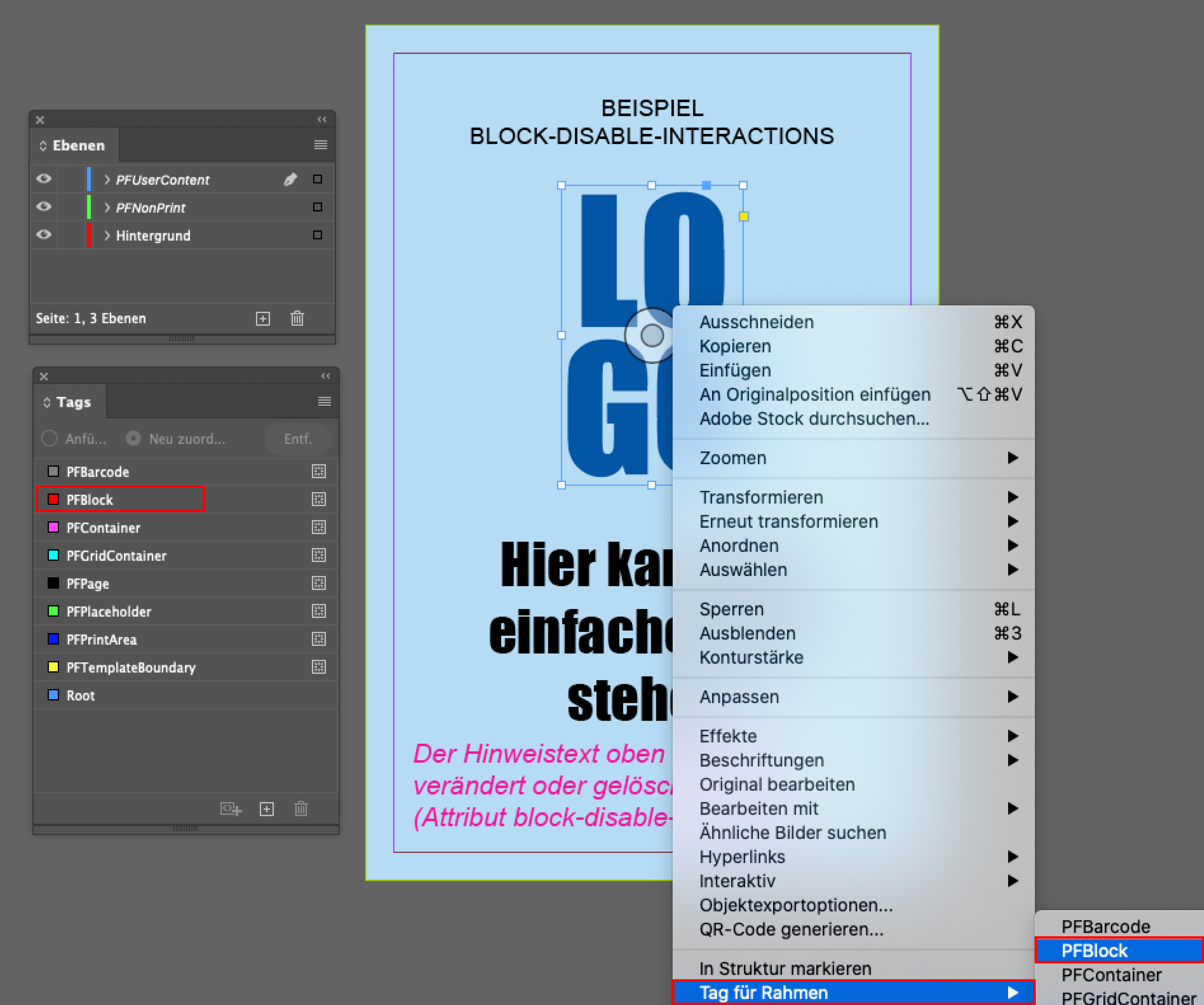 Wählen Sie in Ihrem Layout nun den ersten Bereich aus. Mit einem Rechtsklick auf das Element öffnen Sie das Submenü und können dort über Tag für Rahmen > PFBlock den benötigten Tag zuordnen.