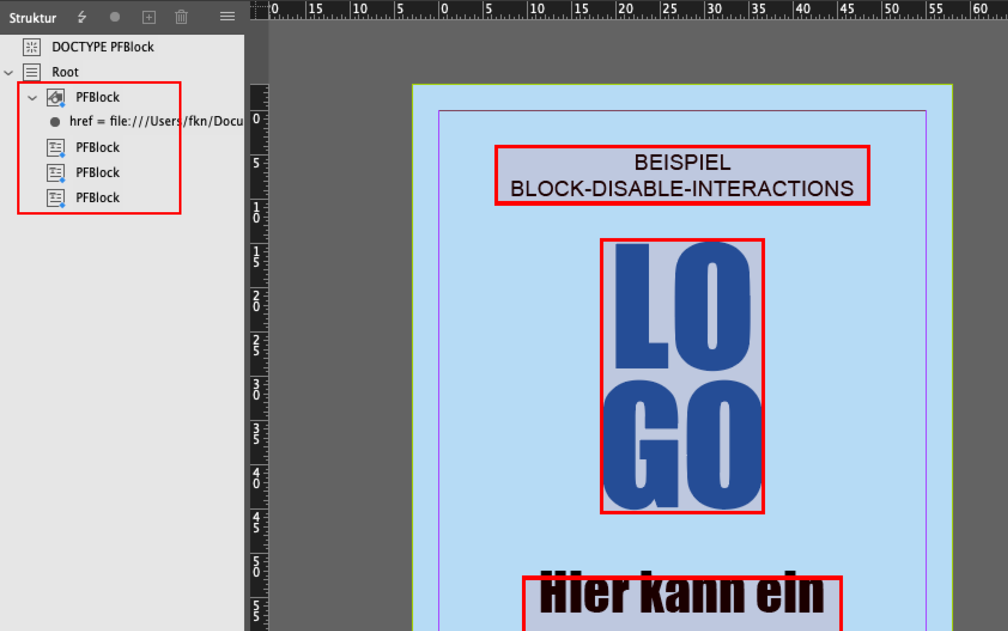 Nachdem der erste Block entsprechend zugeordnet wurde, verfahren wir mit dem zweiten Block (Textfeld) in gleicher Weise. Auch der zu sperrende Text sowie der Hinweistext unten werden als PFBlock getaggt.