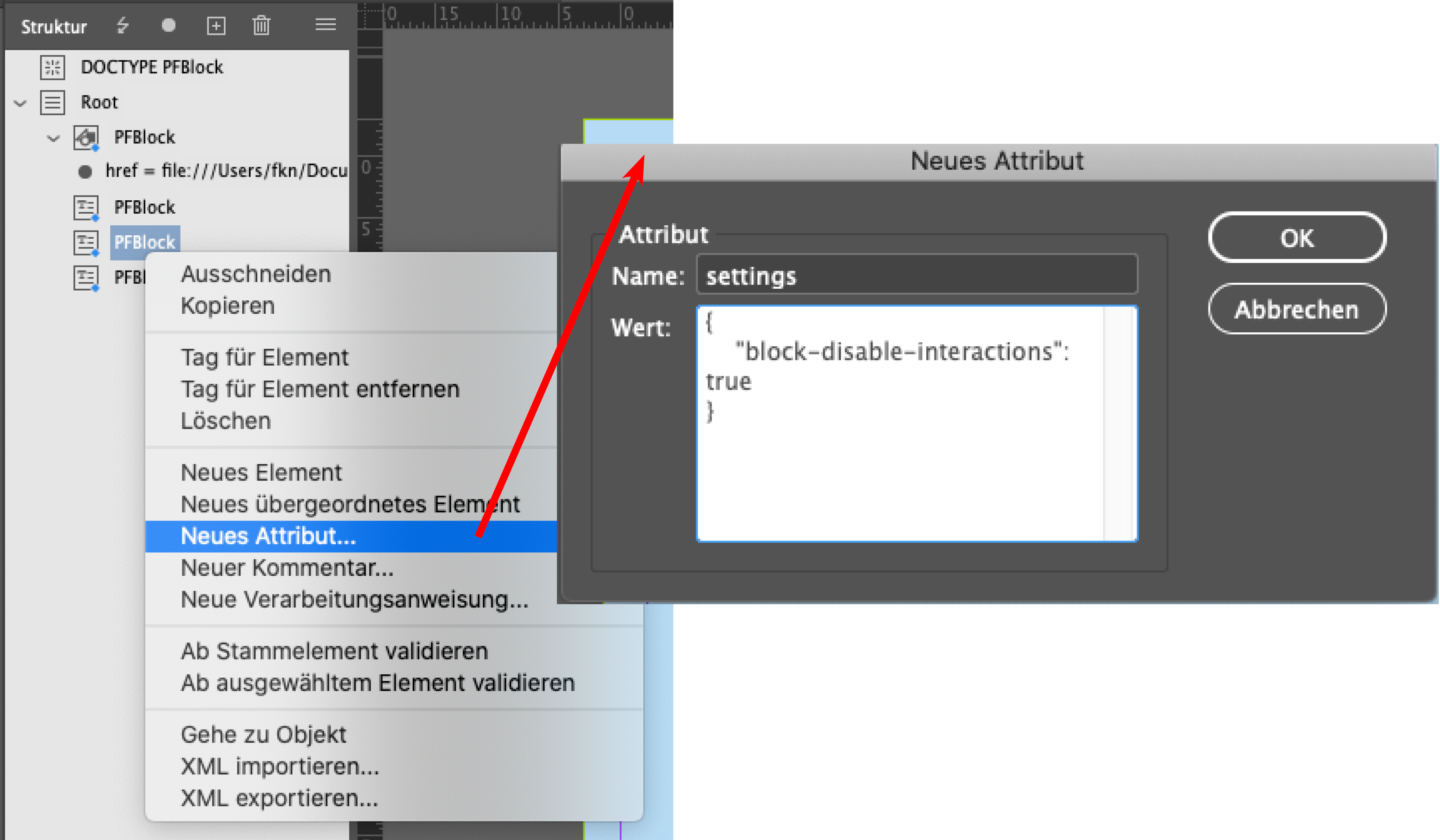 In unserem Beispiel möchten wir festlegen, dass der obere Textblock nicht verändert oder gelöscht werden darf. Mit einem Rechtsklick auf das Text-Element wählen wir Neues Attribut… aus und geben im darauf folgenden Optionsfenster den Namen settings und bei Wert den entsprechenden JSON-Code dazu ein.