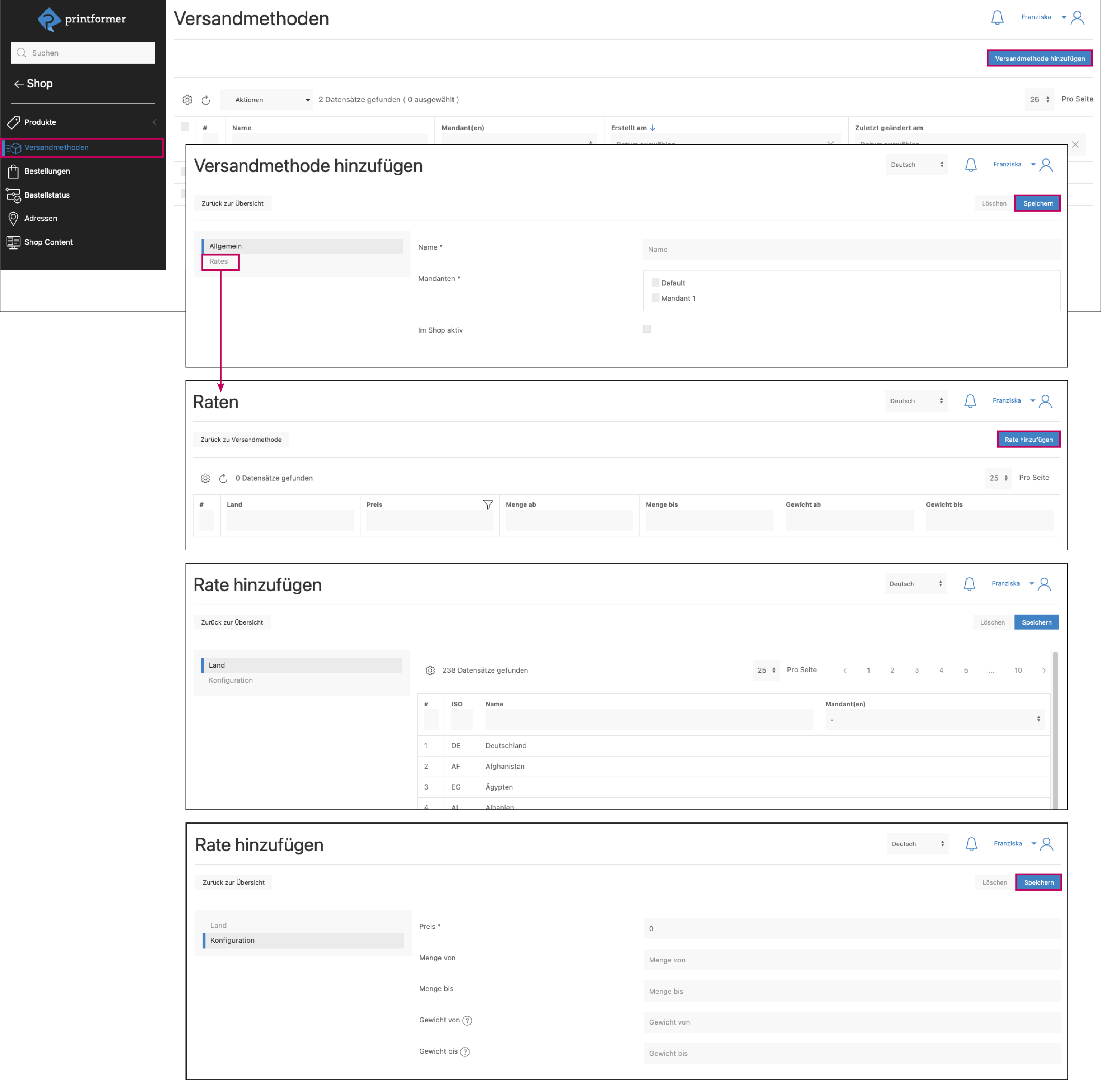 Nach dem Speichern können nun im Untermenü Rates unterschiedliche Versandpreise zu den Ländern zugewiesen werden.