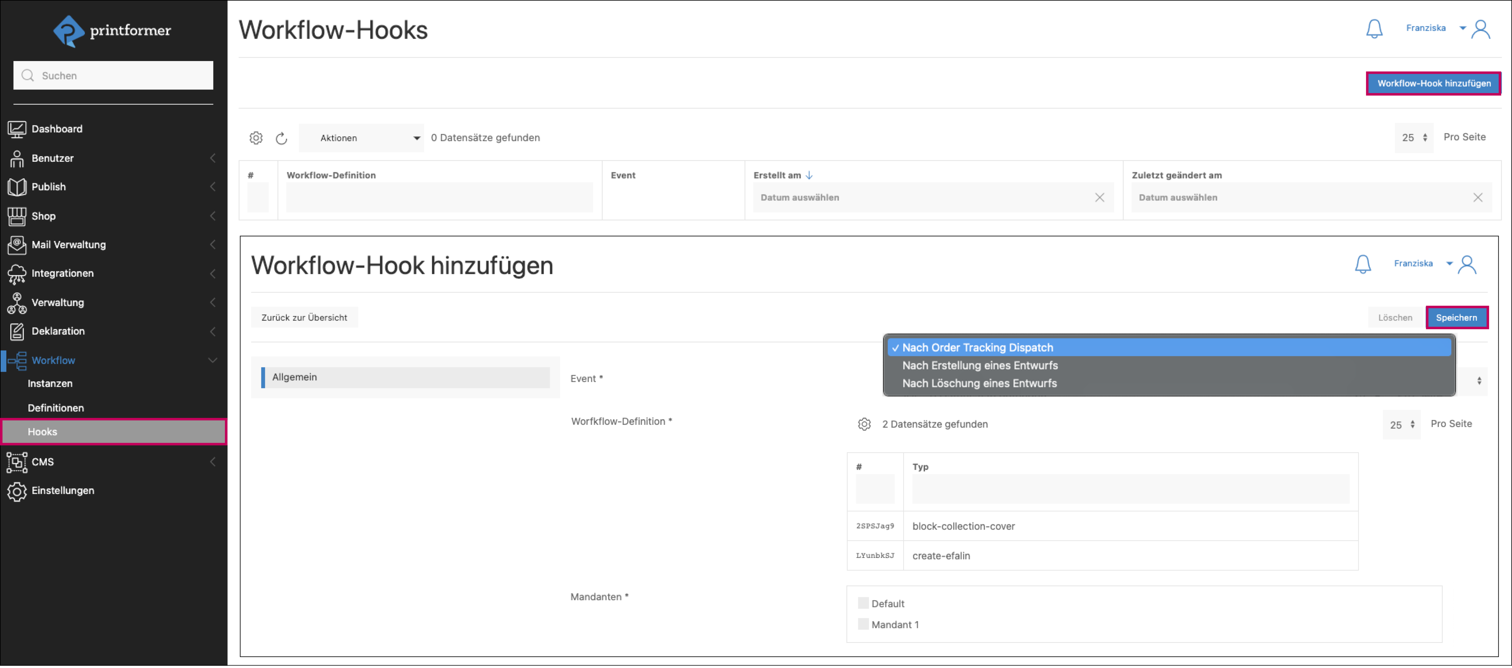 Zusätzlich wird der Hook einem oder mehreren Mandant/en zugewiesen.