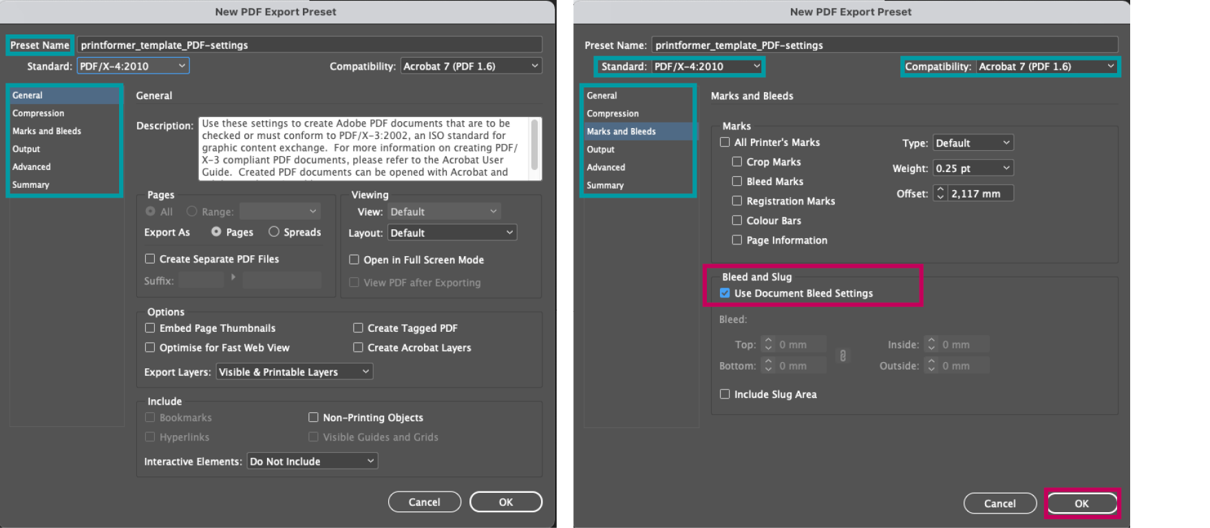 All the required settings can now be specified here. Make sure that you set all the settings correctly you want to attach to your layout and transfer to the printformer. For example, if the bleed settings set up in the document should be taken over, you must activate the corresponding checkbox under Marks and Bleeds > Bleed and Slug. Another important setting is Standard and Compatibility.