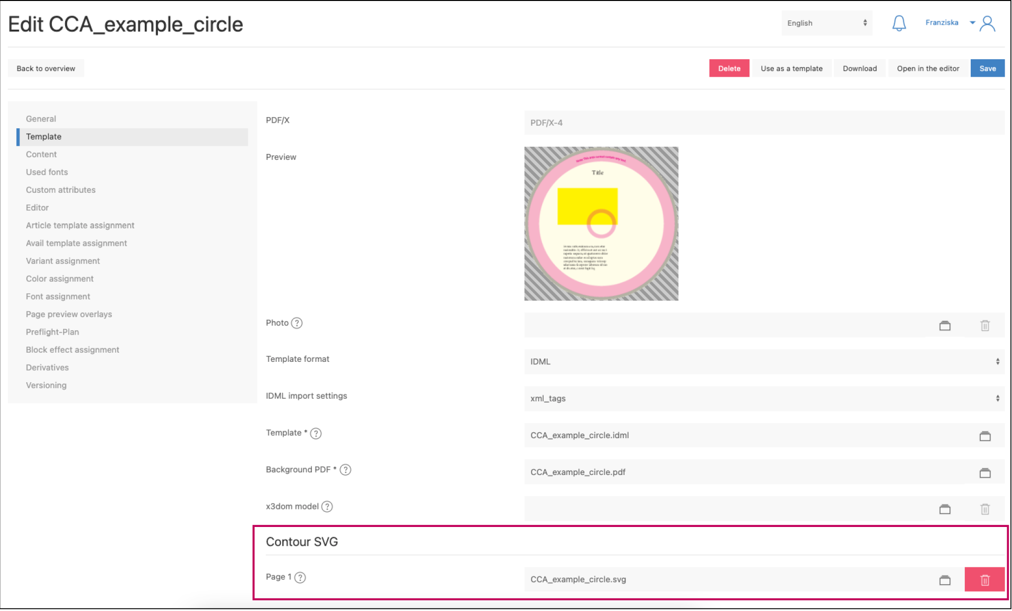 Once the InDesign template has been set up in printformer (configure Templates), the contour SVG can be uploaded: