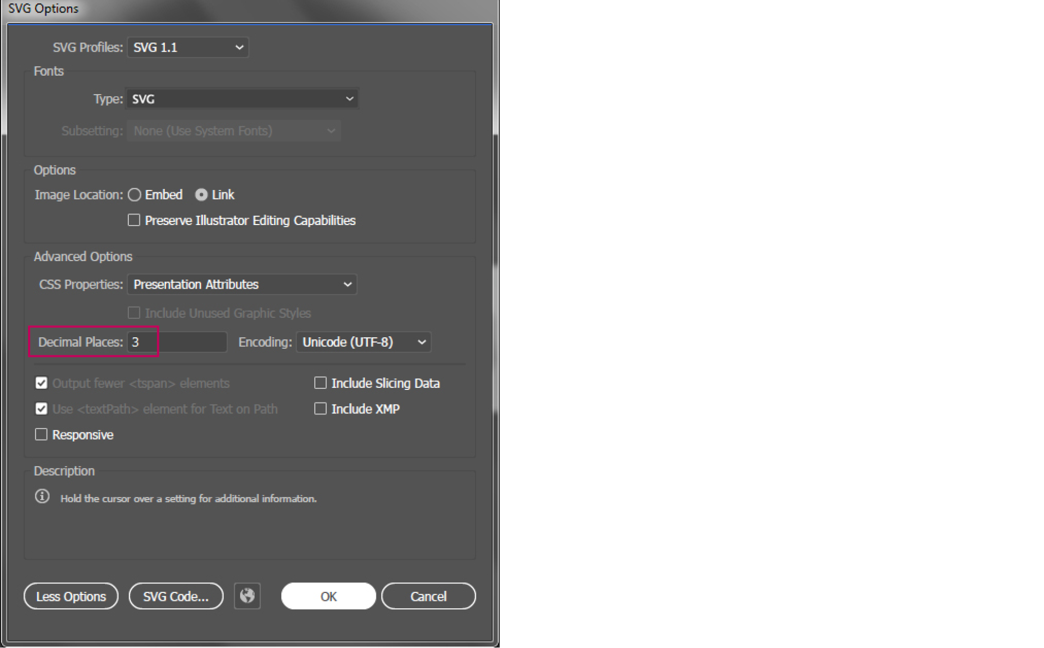 The SVG format converts the document format (unit) when saving. To avoid differences in the conversion, 3 must be entered under Advanced Options > Decimal Places when saving. (The Checkboxes Preserve Illustrator Editing Capabilities and Responsive checkboxes must be deselected.)
