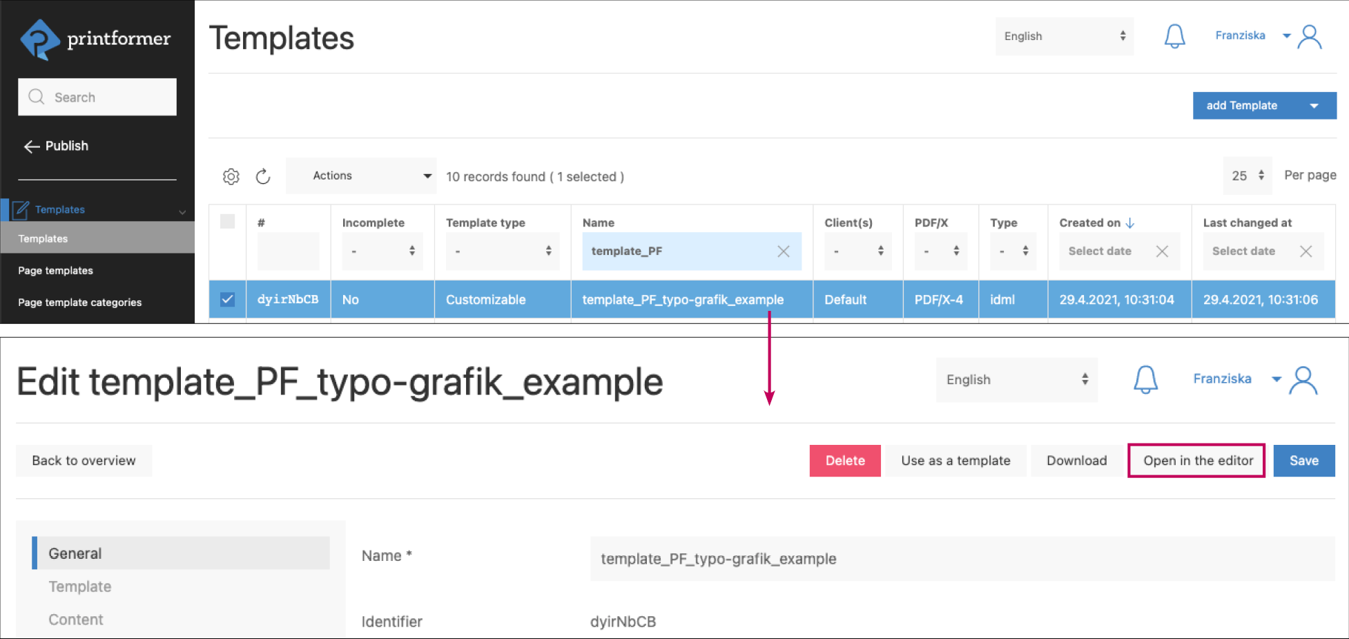 Select »Open in Editor«, the pop-up window that appears can be confirmed without further ado (the functions displayed here are intended for special templates). Now the layout you originally created in InDesign appears in the printformer editor.