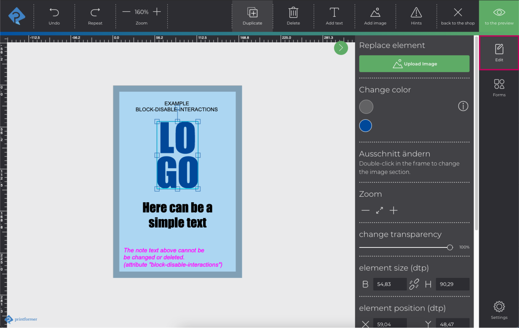The individual elements (graphics and text in our example) can be edited by clicking. (A click selects the graphic frame and a double click the content.) The corresponding menu appears on the right. The placeholder for graphics/images can be replaced by another file. The image section/zoom as well as the transparency can be changed and the element repositioned or rotated. (Transparency is not possible with SVG files.) If there are several elements, the arrangement (in the foreground/background) can be adjusted by Layer. These editing options are also available for texts. In addition, the font type/size can be changed and text can be entered.