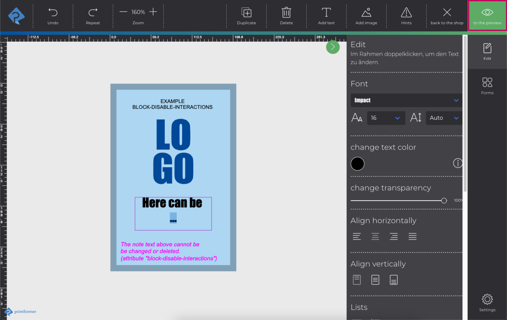 The editing options of the printformer editor can be restricted in InDesign by creating attributes, and also in printformer directly.