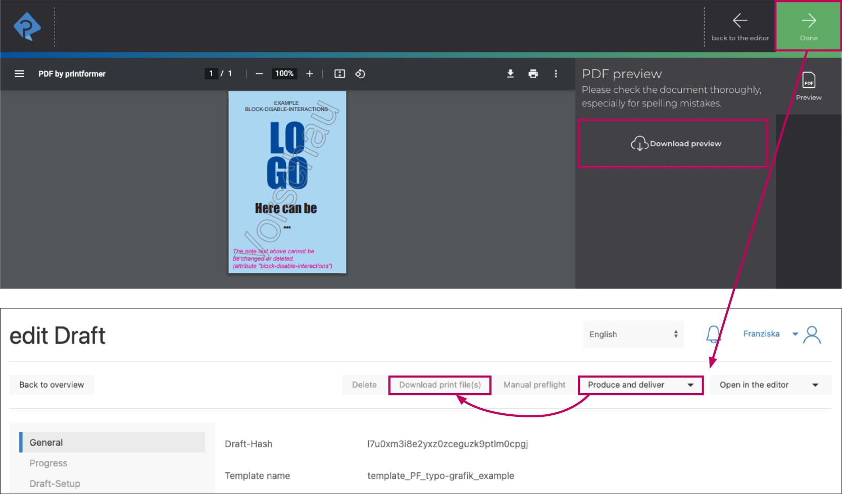 If all the data is correct, click on »Done« to switch to the detailed view of your draft. If you now want to generate print data from the draft, click on »Produce and deliver«. As soon as the process is complete, the button »Download print file(s)« becomes active and you can download the print data. (This completes the draft and it can't be changed and opened any more).
