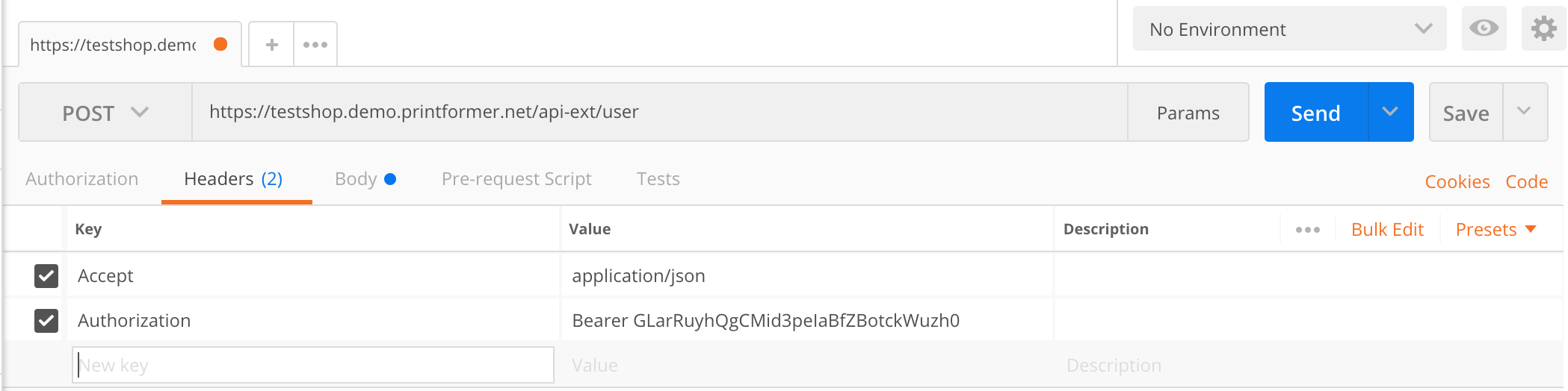 First we call Method “api-ext/user” with Postman and add authorization header that contains a combination of the word Bearer and API Key which is separated by a space.
