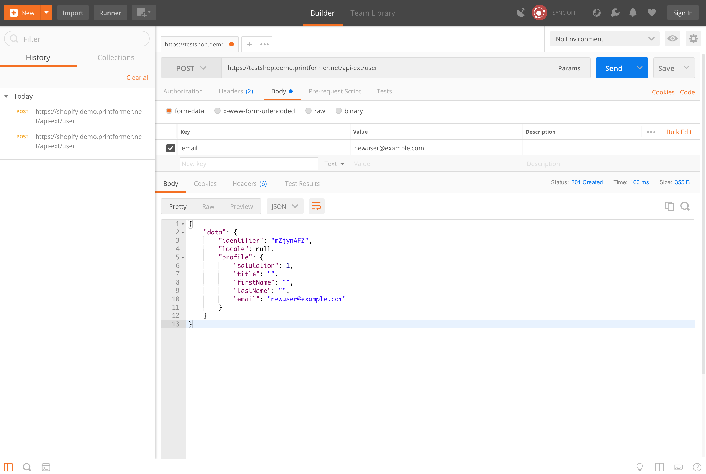We also add a email address to our user and post our request to method “api-ext/user”. Printformer give us a response with a user identifier that we need in the next steps.