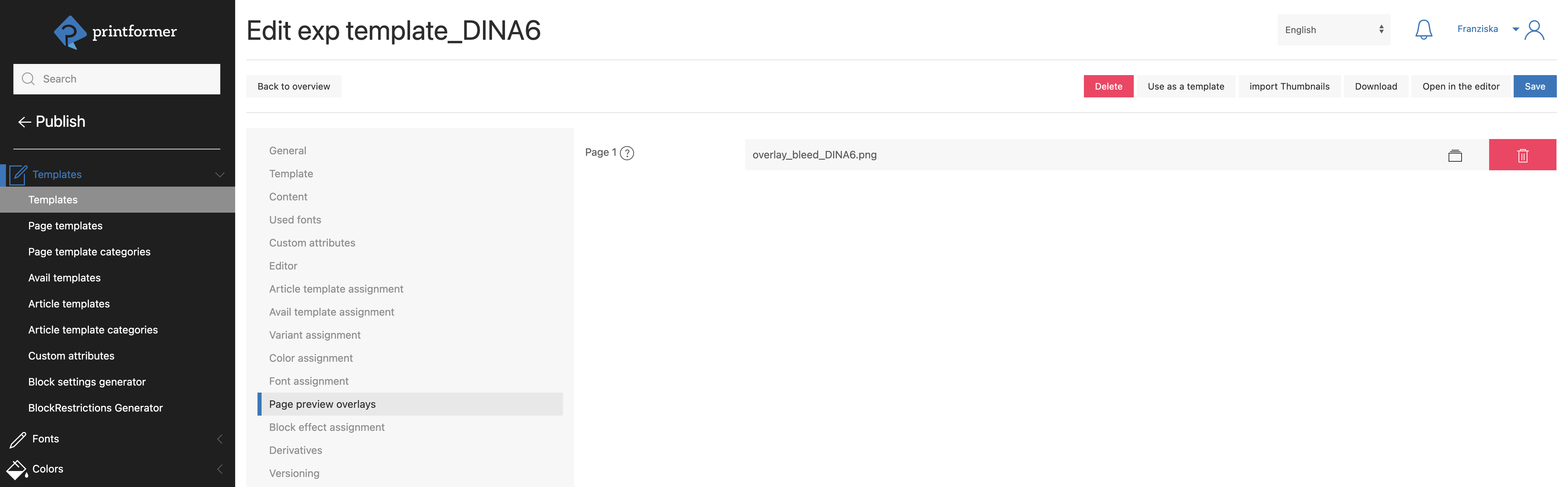 In addition, a Page preview overlay (PNG file, format: page format incl. bleed) can be uploaded to highlight the bleed area in the editor.