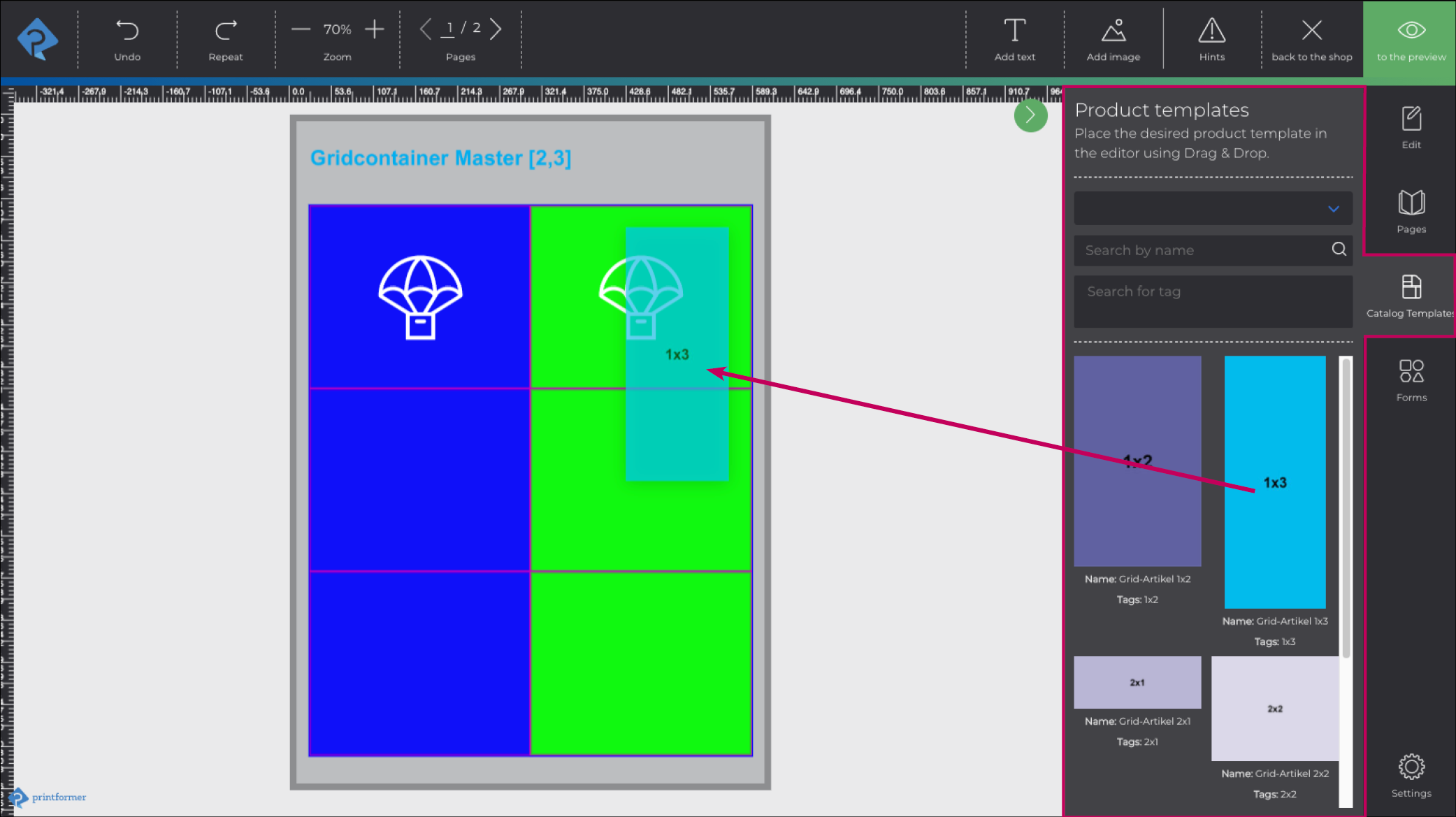 For inserting article templates into the container later, an additional tag must be added in the printformer (after uploading the template), which indicates the format of the template. This is again defined by the number of units in the grid, the notation is "number of columns"x"number of rows".