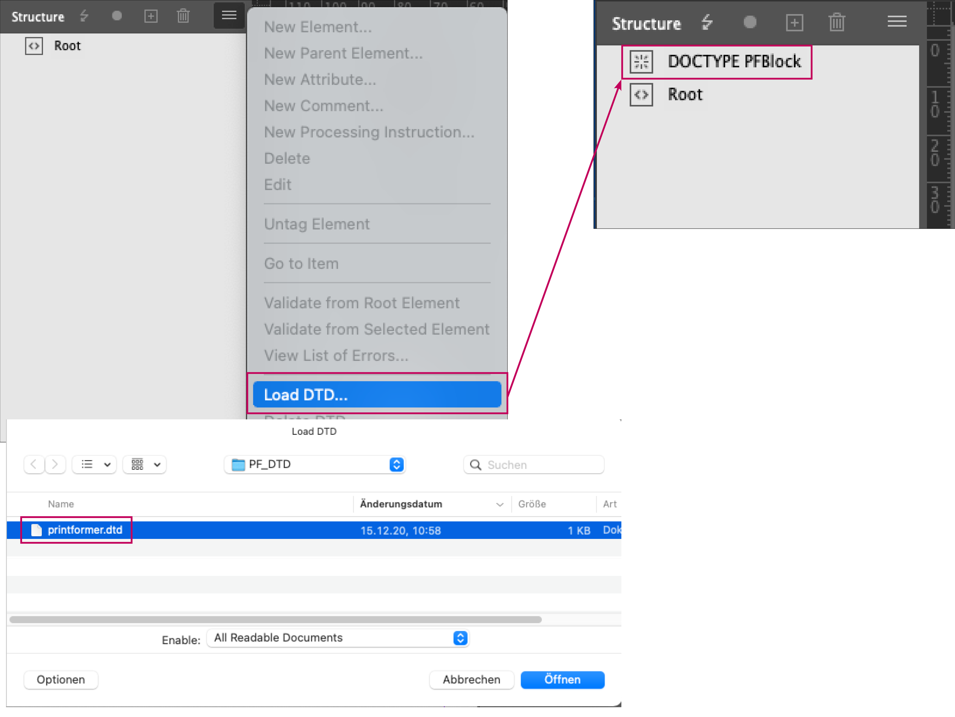 In the »Structure Window«, click on the icon in the upper right-hand area to open the submenu. There you select the option Load DTD…