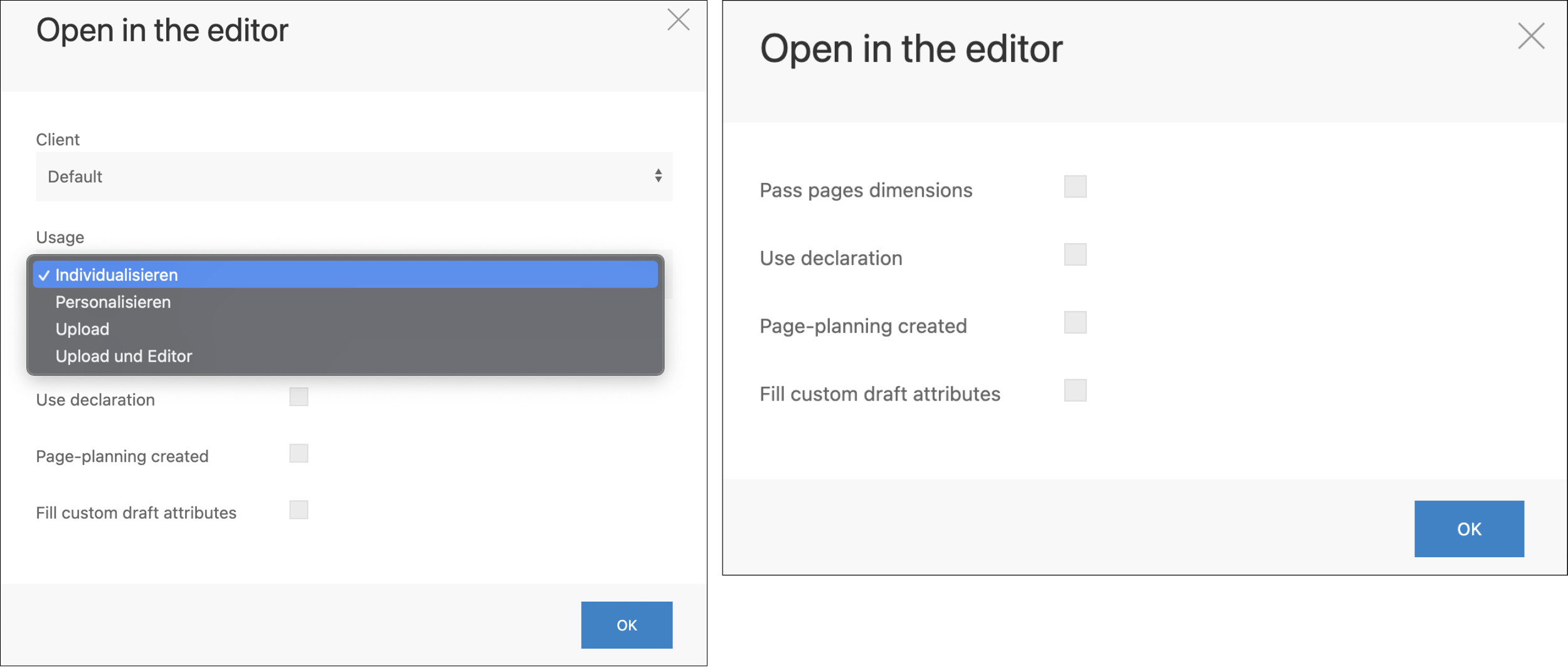 Pass pages dimensions | Offers the possibility of individually setting the page format of the template. The BlockSettings block-scaling and block-scaling-keep-proportions can be used to define in advance in the IDML how the elements of the template should behave. |