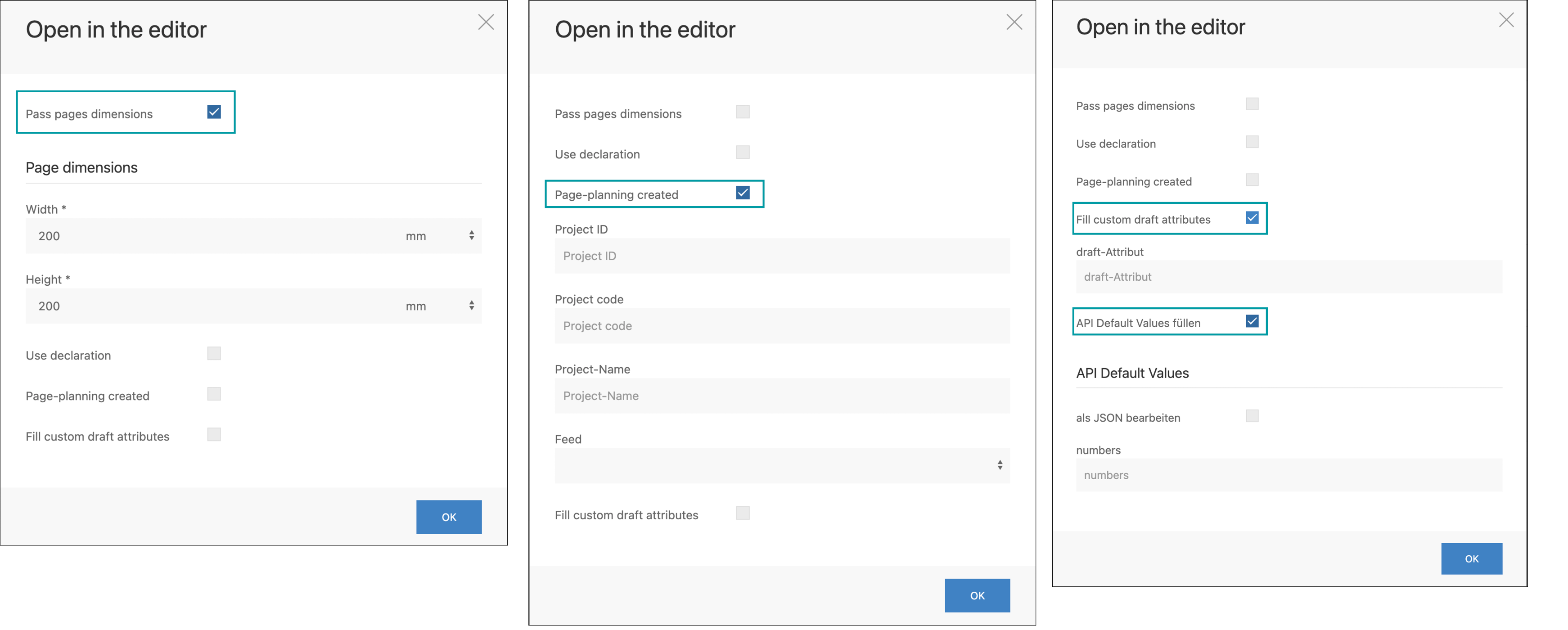 Create Page-planning | A page planning can be created that creates a link between draft and feed. Optionally, project ID, project code, project name can be specified and the wanted feed must be selected. |