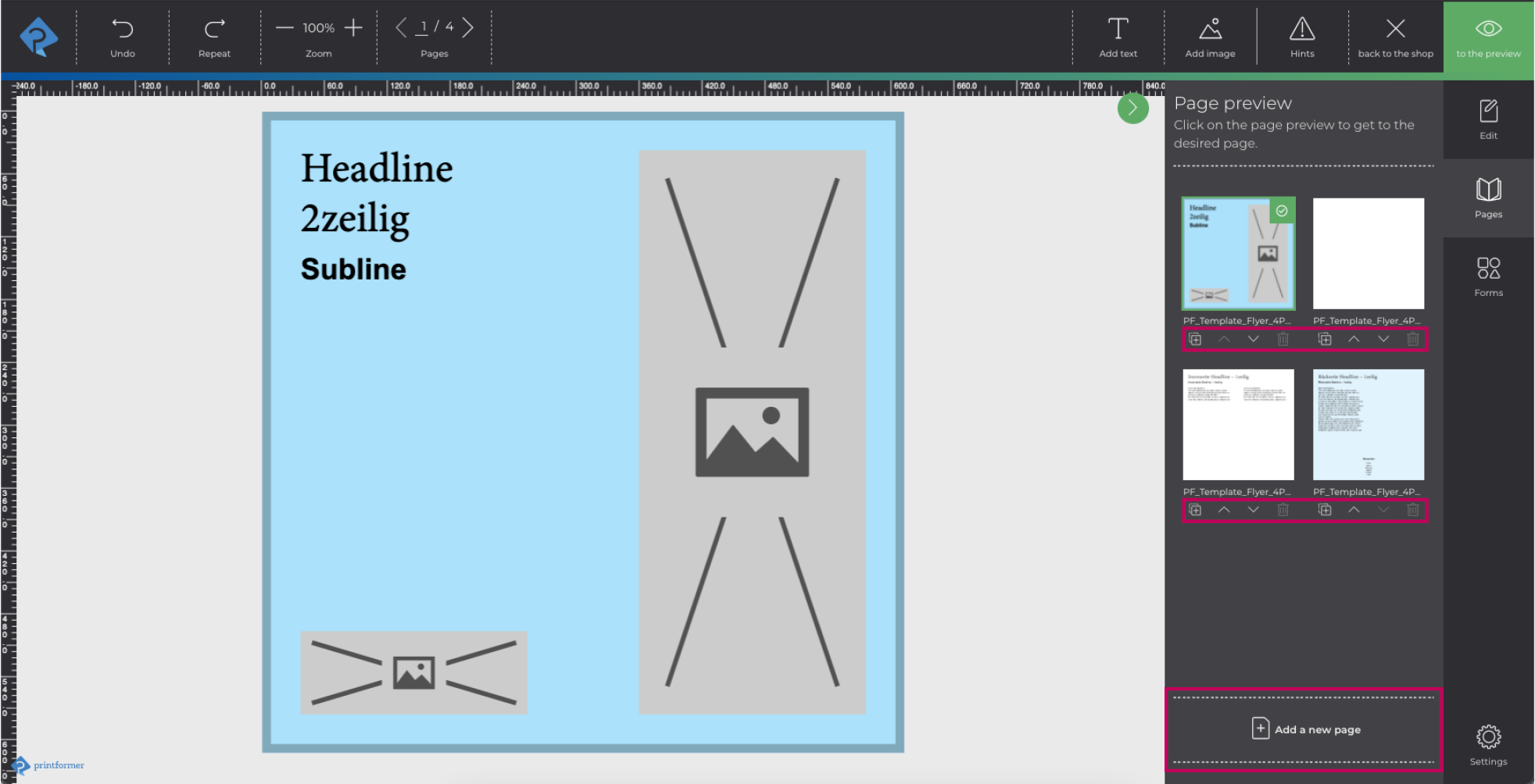 If templates with several pages are created in printformer, the Pages tab will appear in the editor (side-bar) for selecting the respective page.