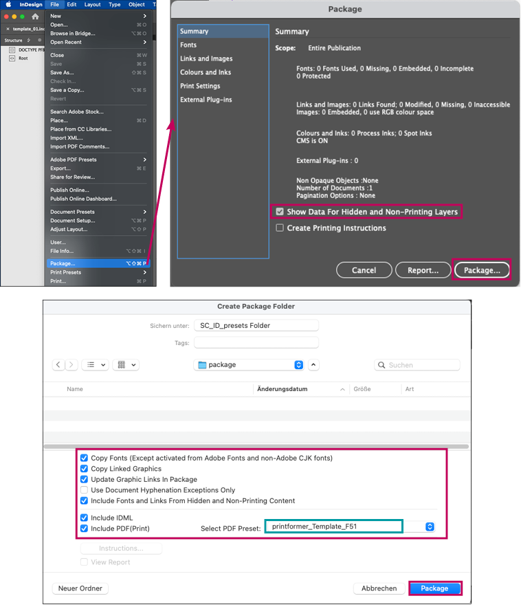 In the following dialogue window »Package« you can check again whether all links, fonts etc. are correctly integrated in the document. Activate the checkbox »Show Data For Hidden and Non-printing layers« below and confirm by clicking on »Package...«.