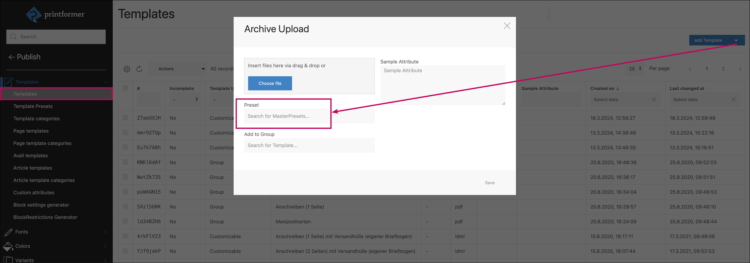 During the archive upload, the preset is then assigned via a form field (enter the name):