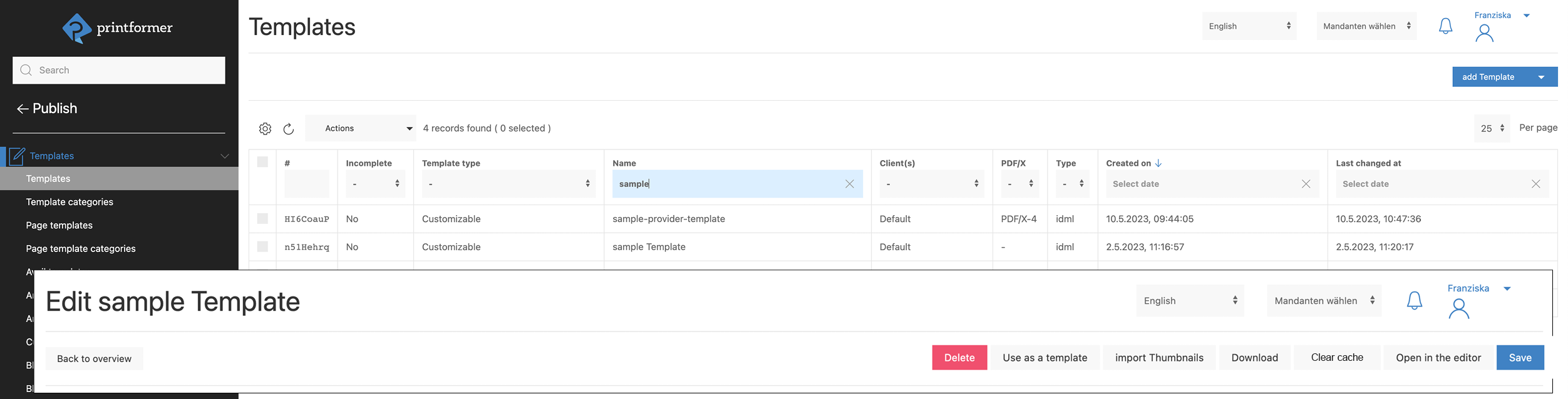 In the submenus Templates, Page templates, Avail templates, Article templates, the corresponding IDML templates are uploaded and configured, also existing templates are adapted (see configure printformer templates).