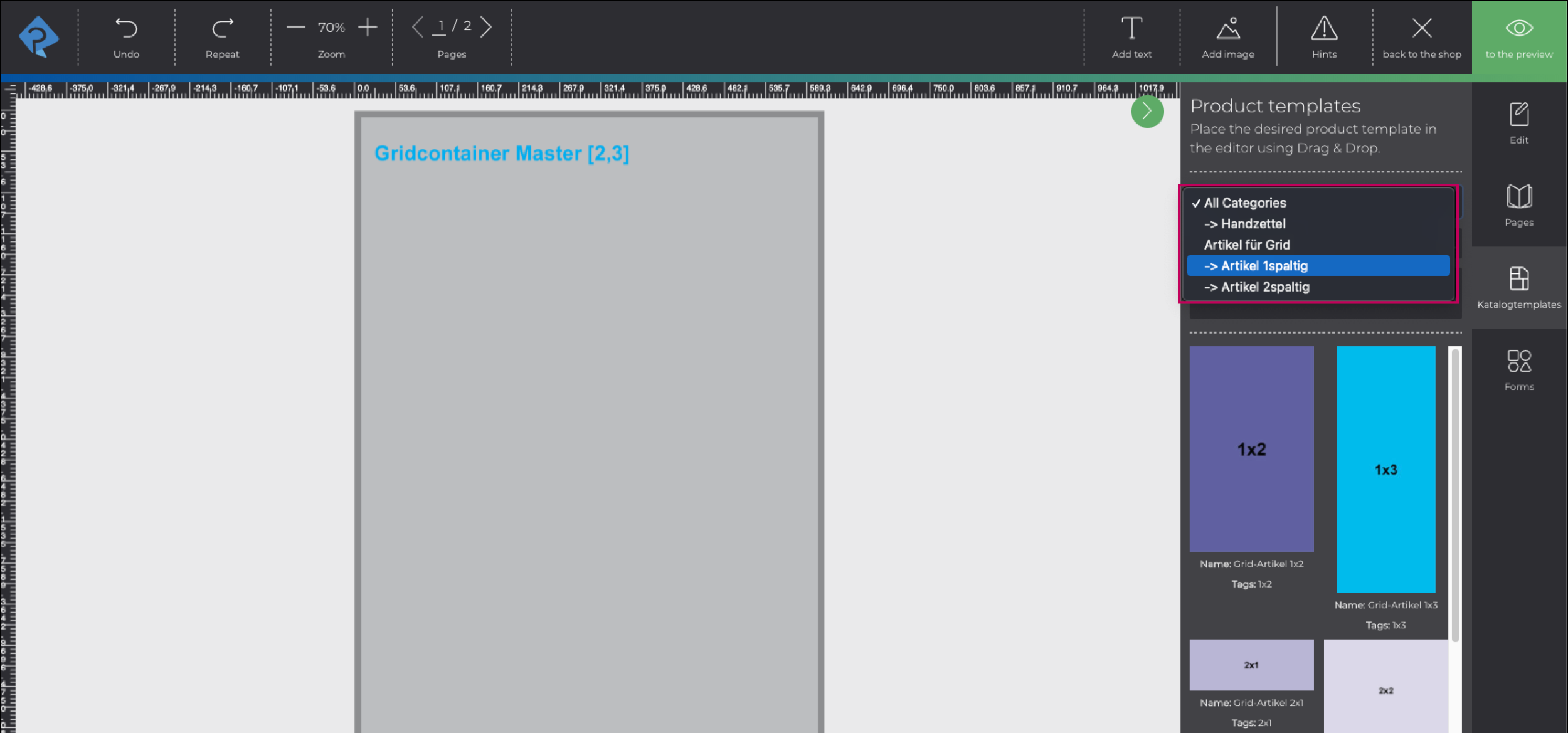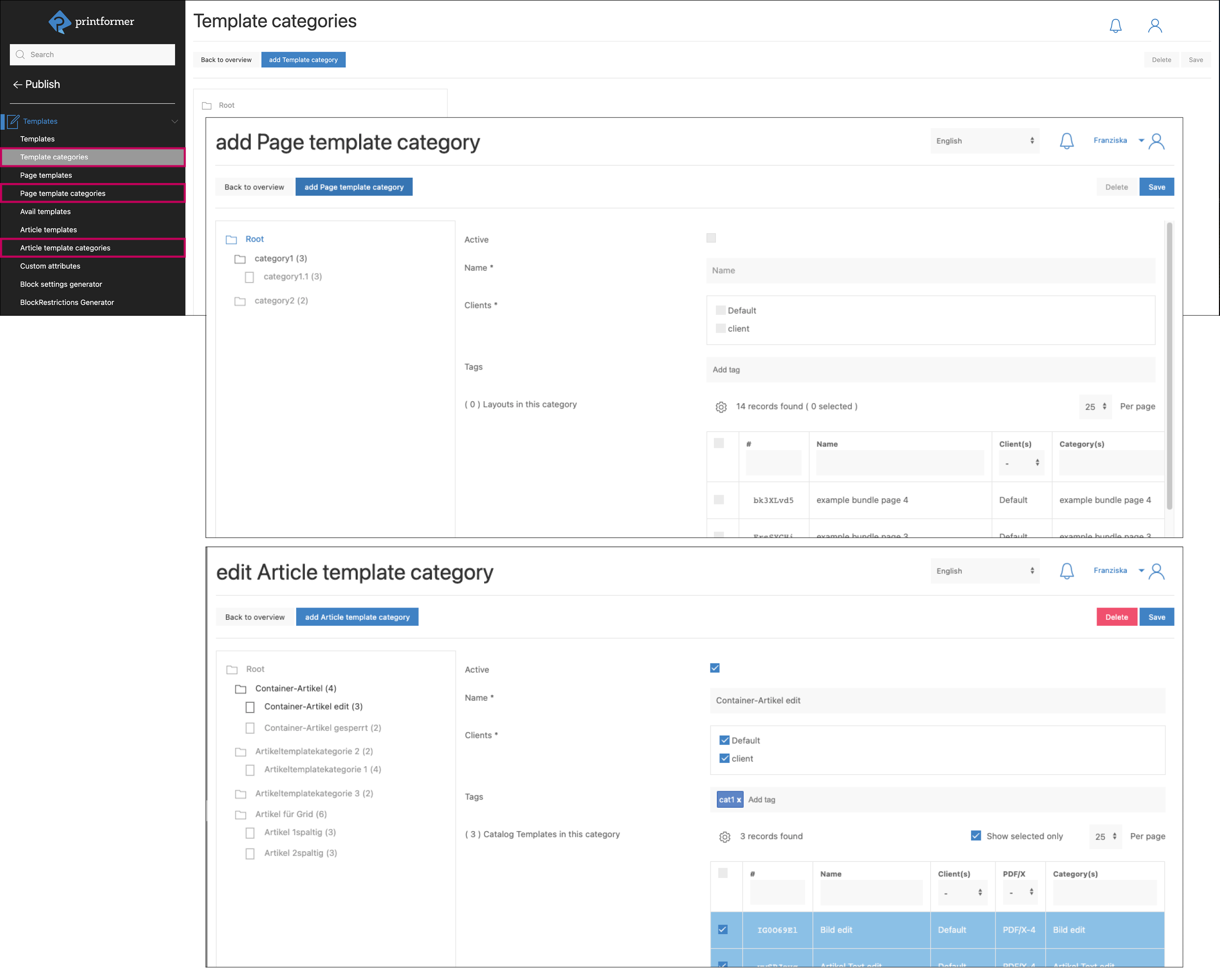 In the three menus (template categories, page template categories, article template categories; functionally structured in the same way) single templates can be assigned to different categories. In the printformer Editor, they are then displayed in the sidebar in the Group Templates, Layouts or Catalog Templates menu, structured according to categories.