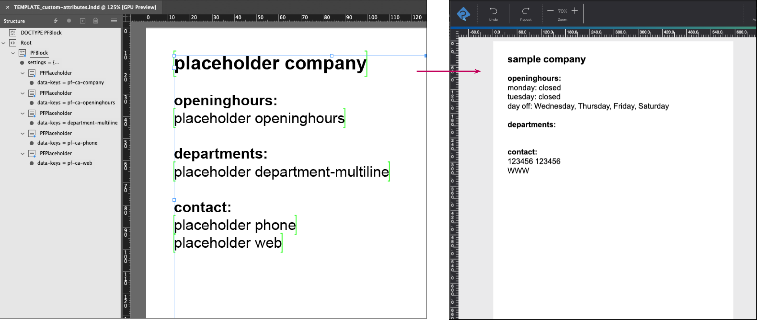 If the IDML file contains placeholders with these DataKeys, the tagged text of the file is replaced by the default value in the printformer editor.