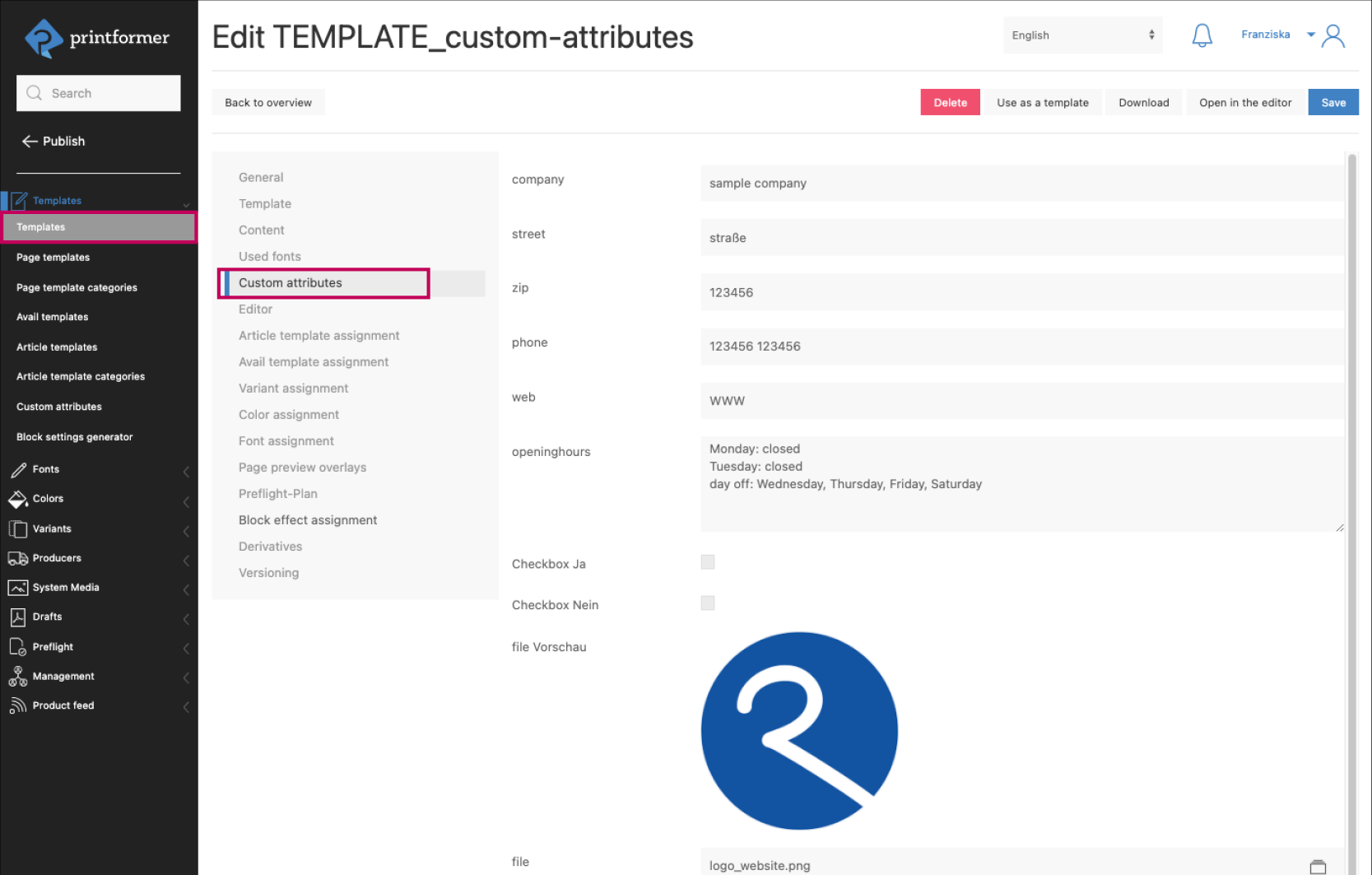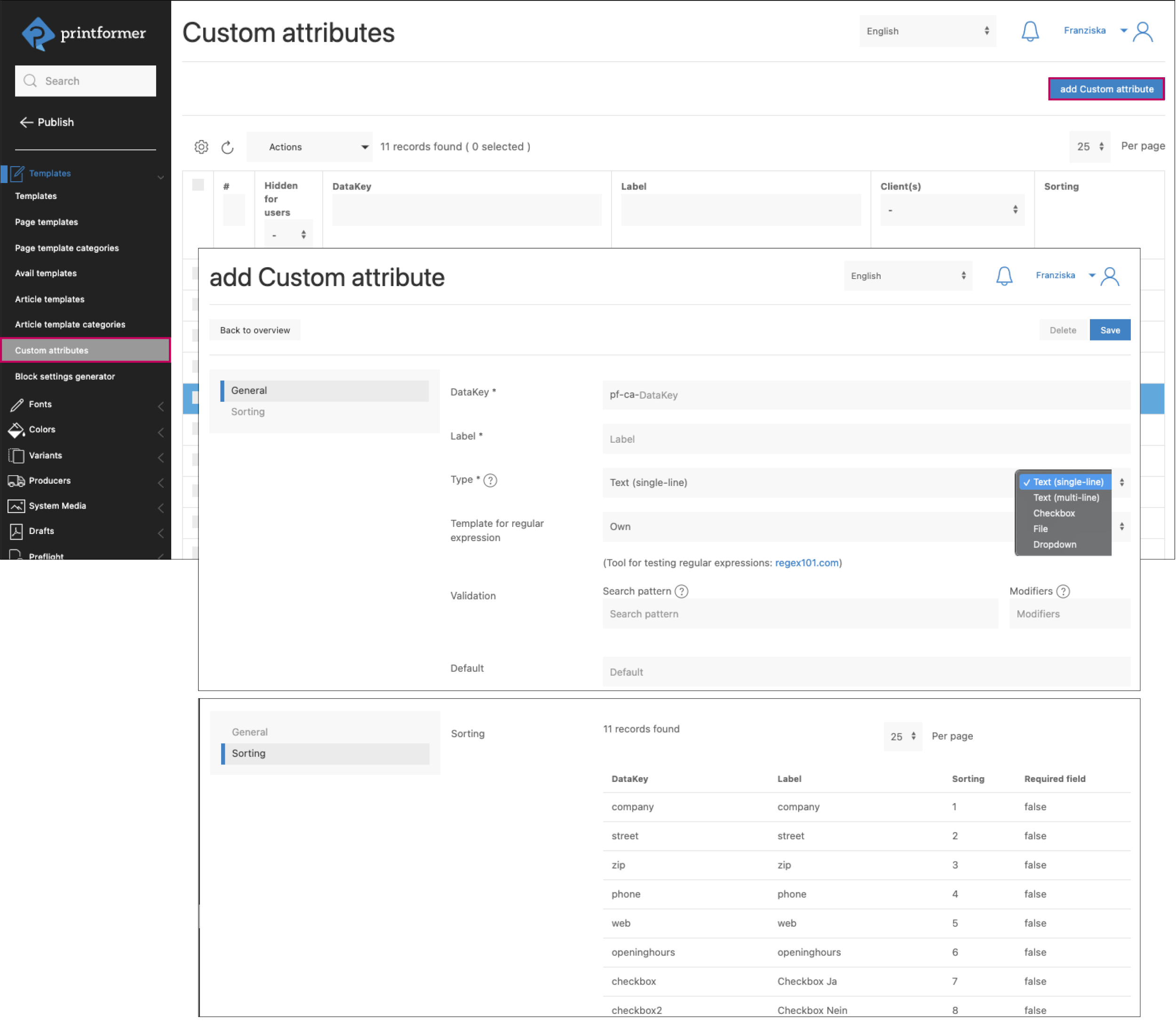 For this purpose, a DataKey incl. default value (content of the placeholder as long as it is not overwritten) is created under Templates > Custom attributes.