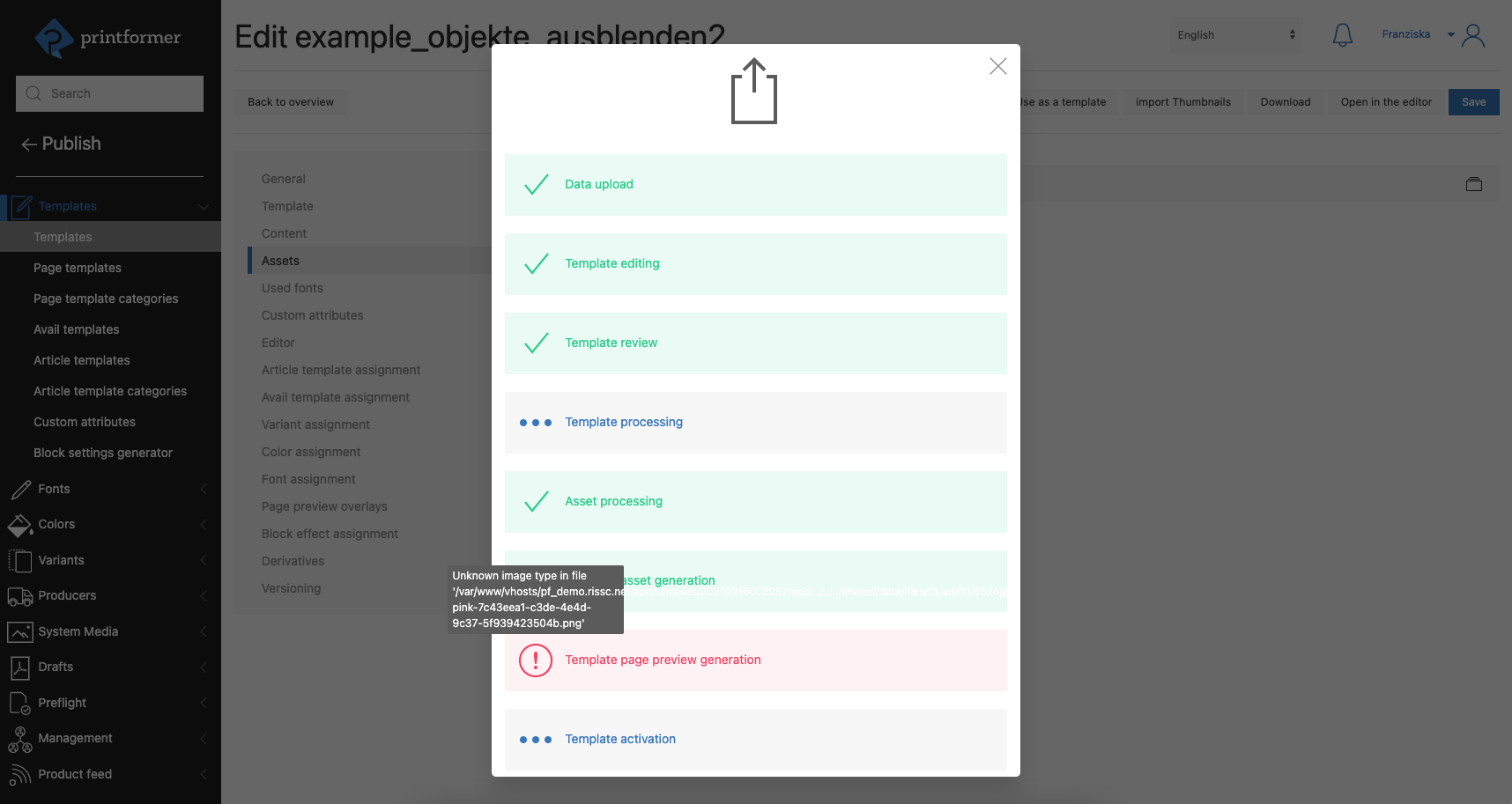 If errors occur here, this is indicated accordingly in the left menu area. In our case, the missing assignment of a file (logo). This can then be linked as before in the corresponding menu via the folder symbol, the file manager and then saving. (Another example is missing fonts used in the document, which can then be uploaded later).