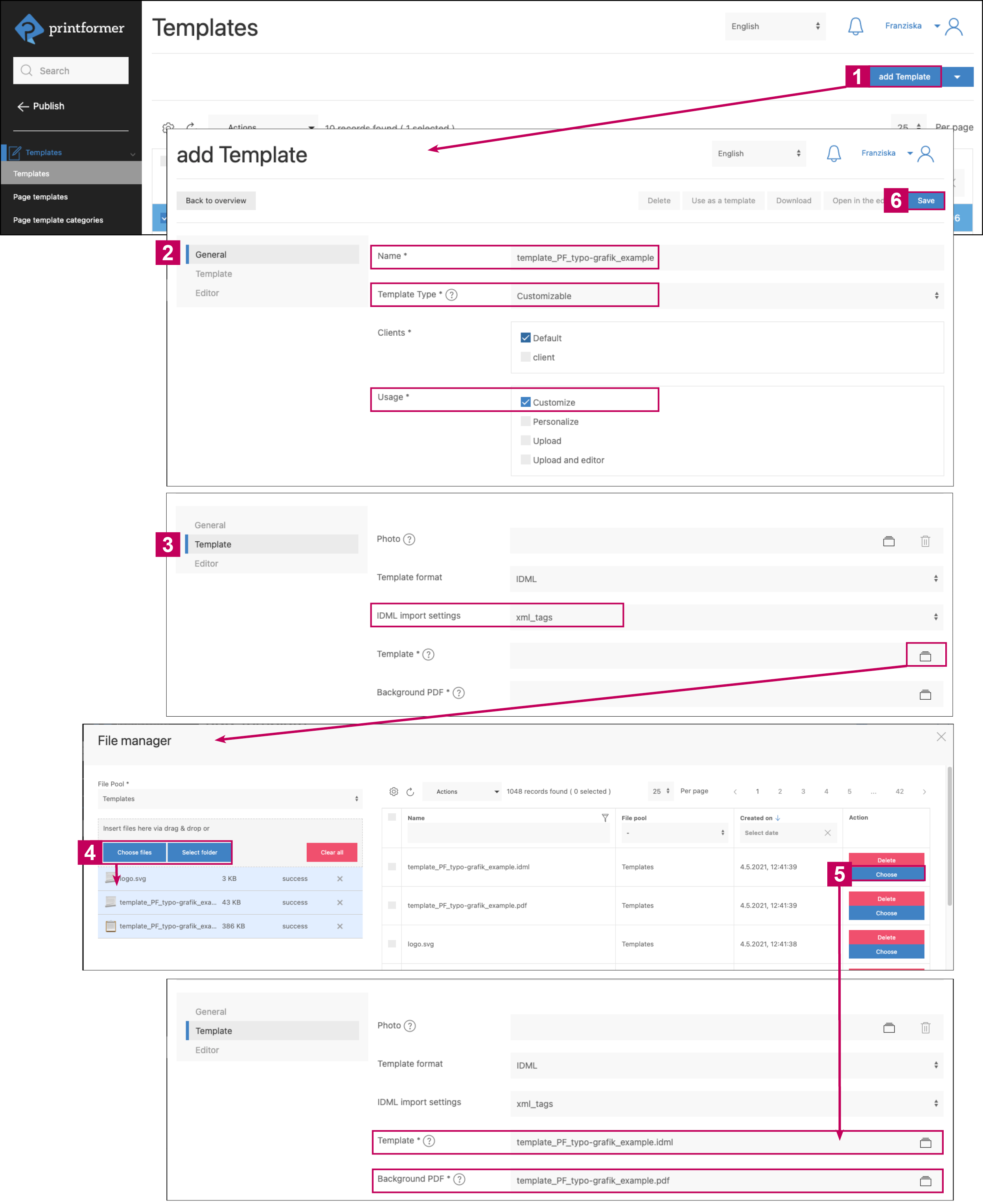 Now link the files uploaded in the previous step (Template = IDML file, Background PDF = PDF file) by clicking on the respective folder symbol of the corresponding line.