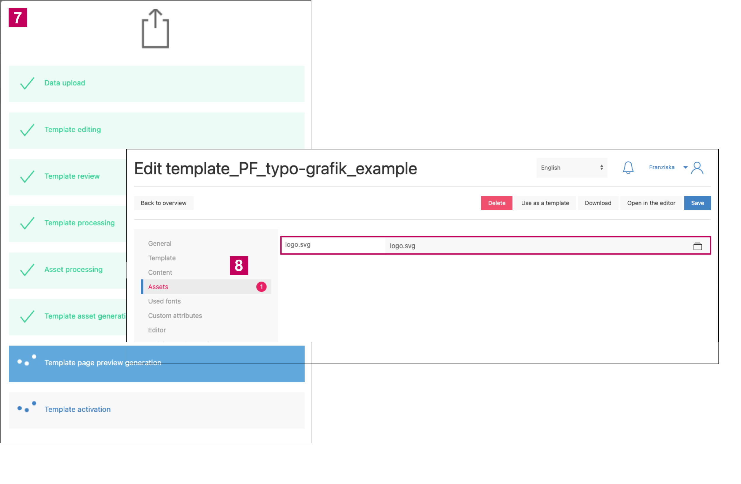 If errors occur during the upload, this is indicated by an exclamation mark in the template processing.