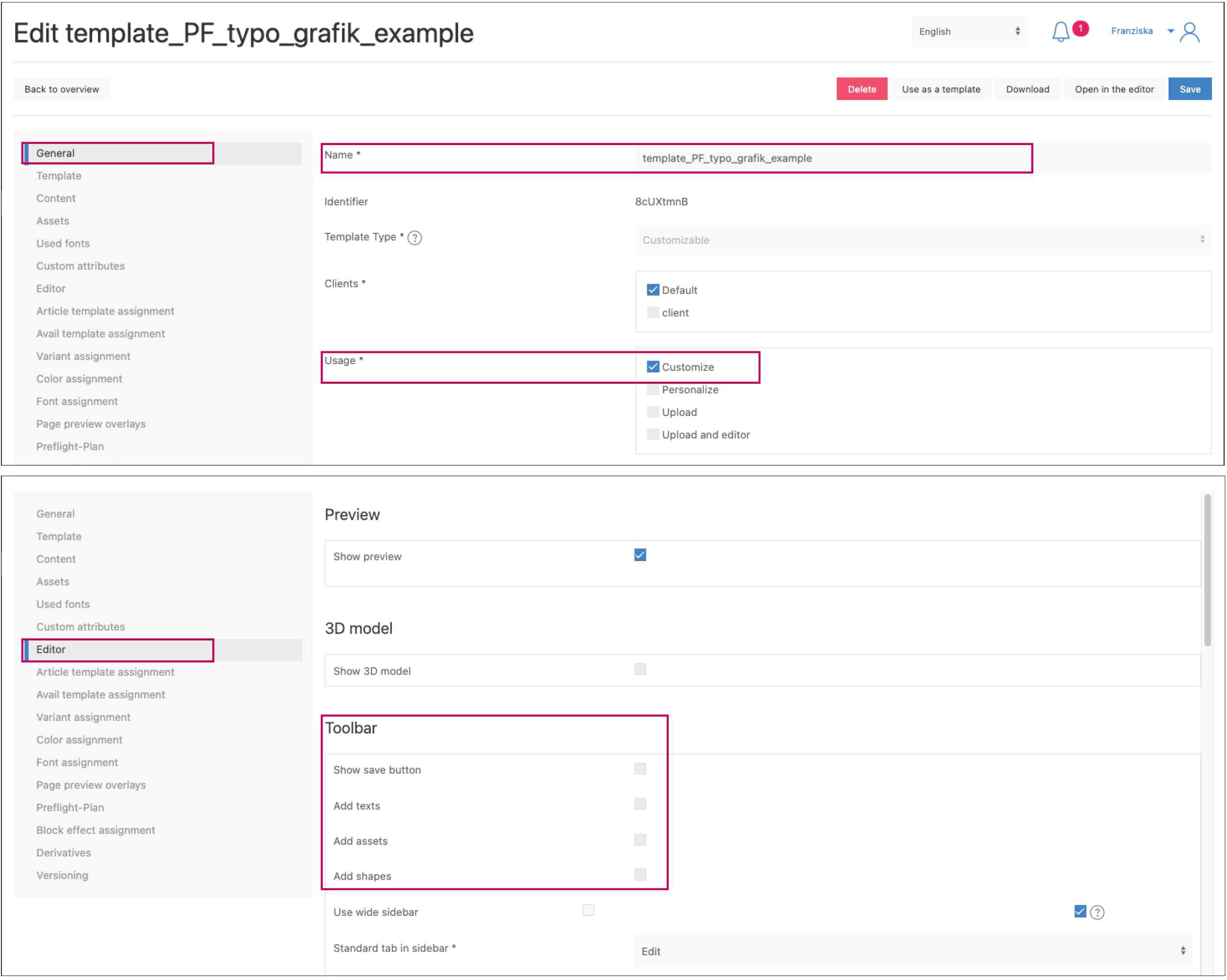 Since both the graphic and the text will be editable, we select »Customizable« (Template Type) and »Customize« (Usage).