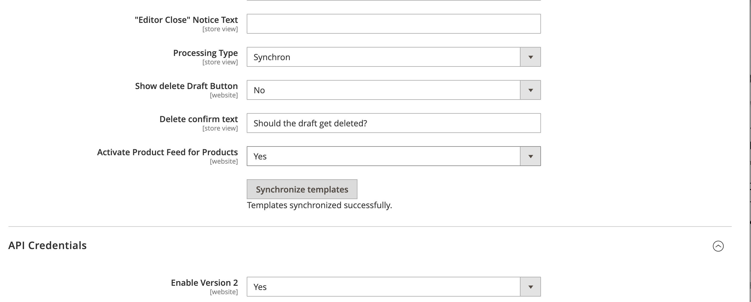 Über den Button “Synchronize Templates” werden die Web2Print Templates aus dem printformer mit dem Magento synchronisiert. Im Erfolgsfall erhalten Sie eine Meldung direkt unter diesem Button.