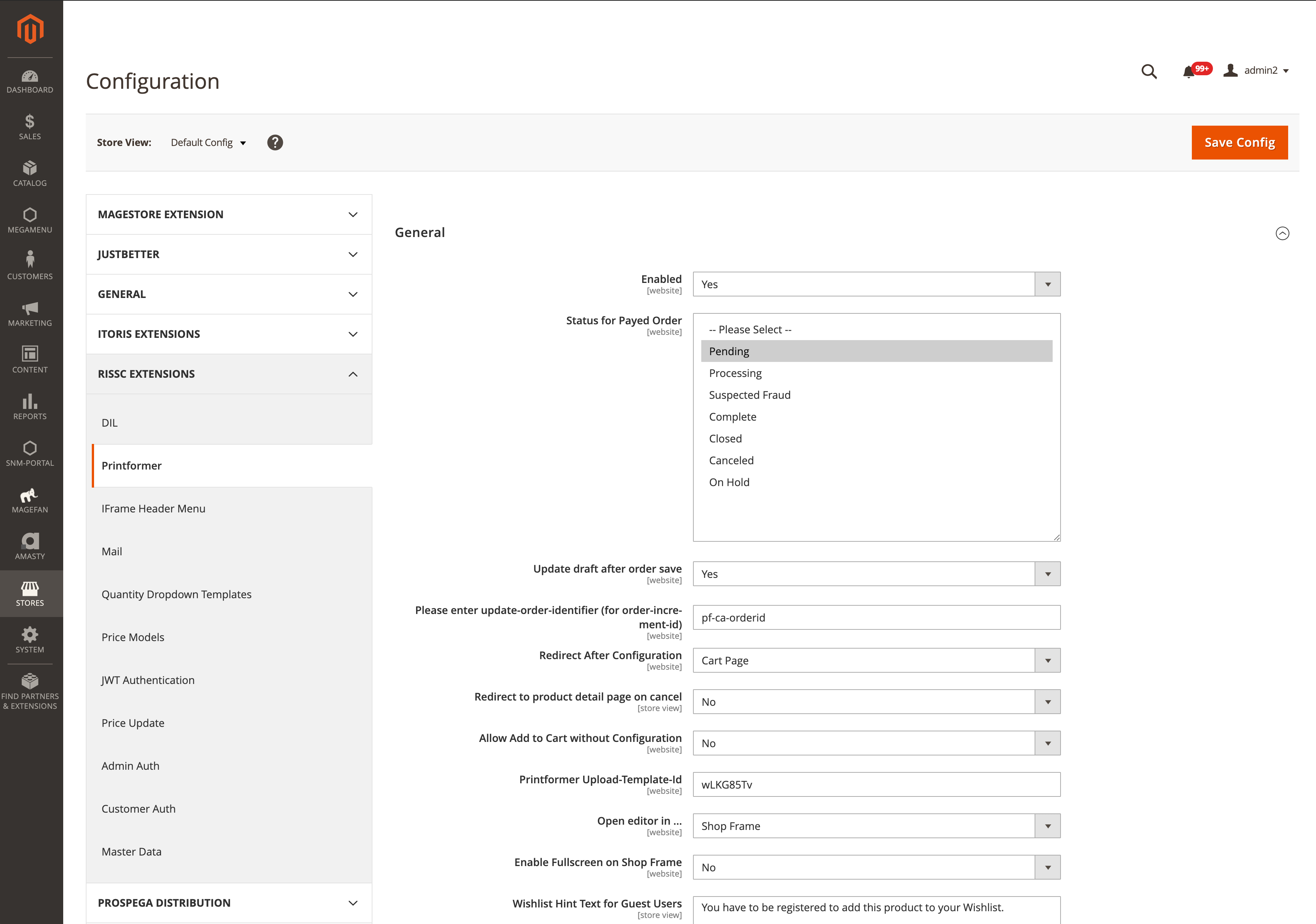 Nach der Installation der Extension erscheint ein neuer Menüpunkt “Printformer” in der Store Konfiguration