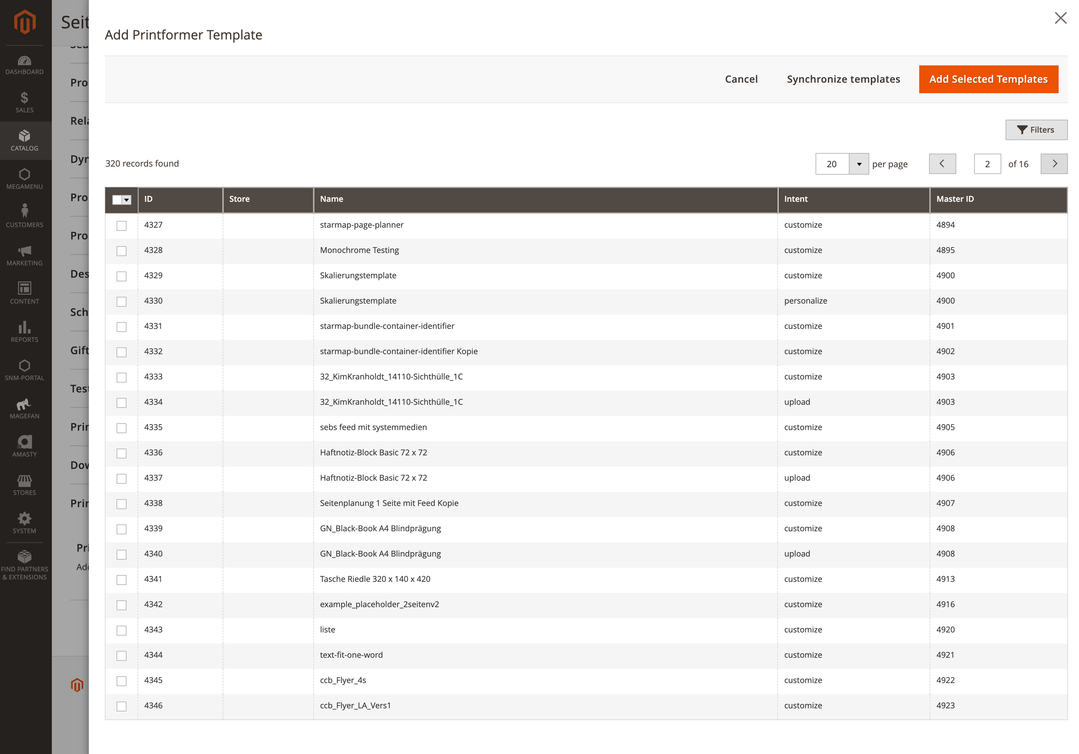 Am Shopprodukt kann im Bereich “Printformer Templates” → “Add Printformer Template“ ein Web2Print Template ausgewählt werden. Dazu wählen Sie das Template über die Checkbox aus und klicken auf “Add Selected Templates”.