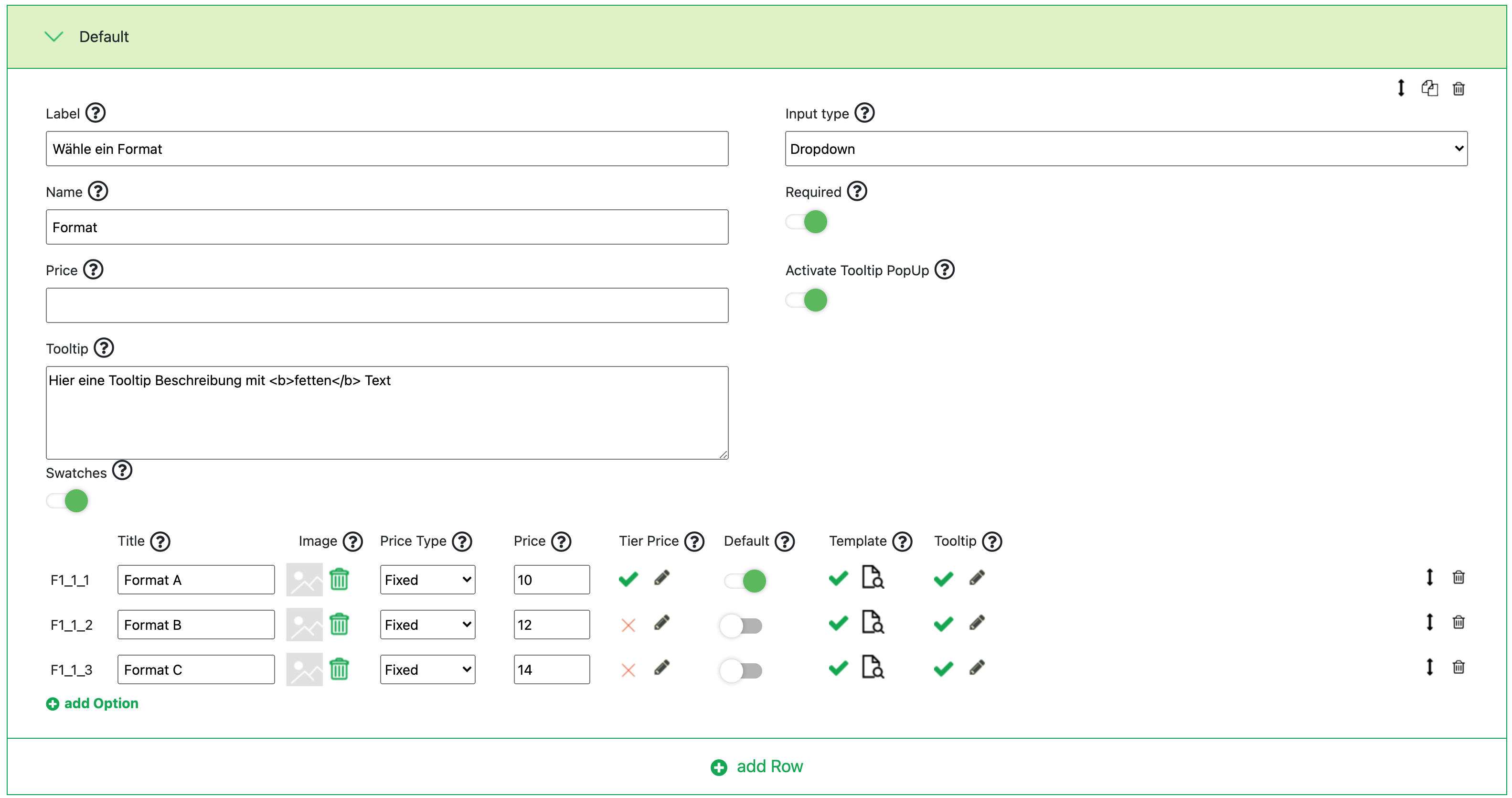 When Tooltips are activated, a tooltip text can be provided for each input type.