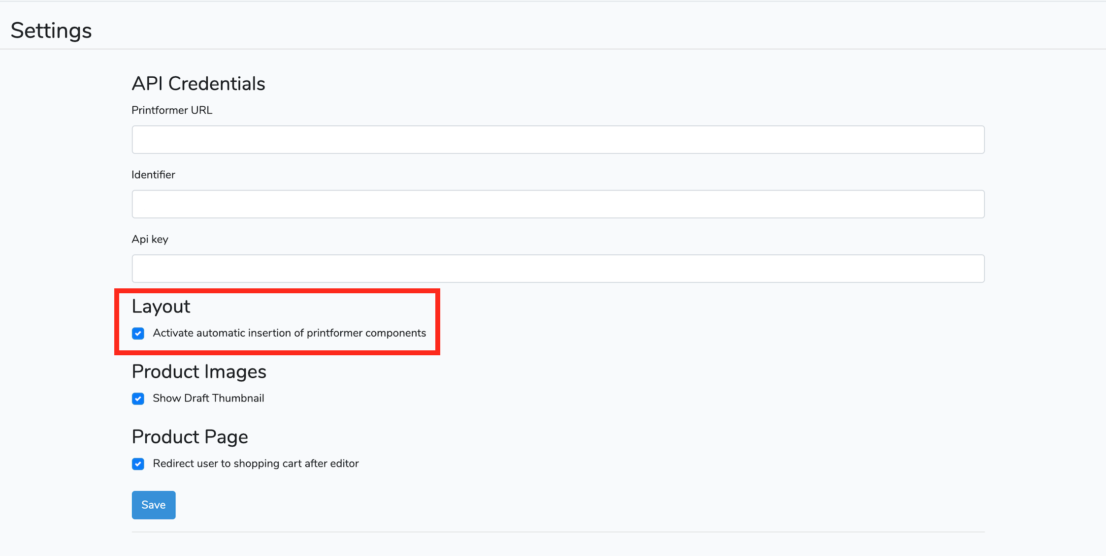 When our printformer components like the design Button or 3D Button not shows correctly in your Template, you can disable the automatically insertion of layout components in the settings under the section Layout. After that follow the Step-by-Step instruction to insert this components in your Template.