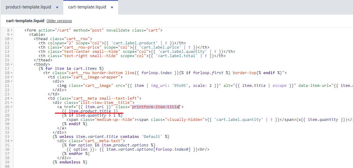 Attach additional css class " printform-item-title " to product's title link