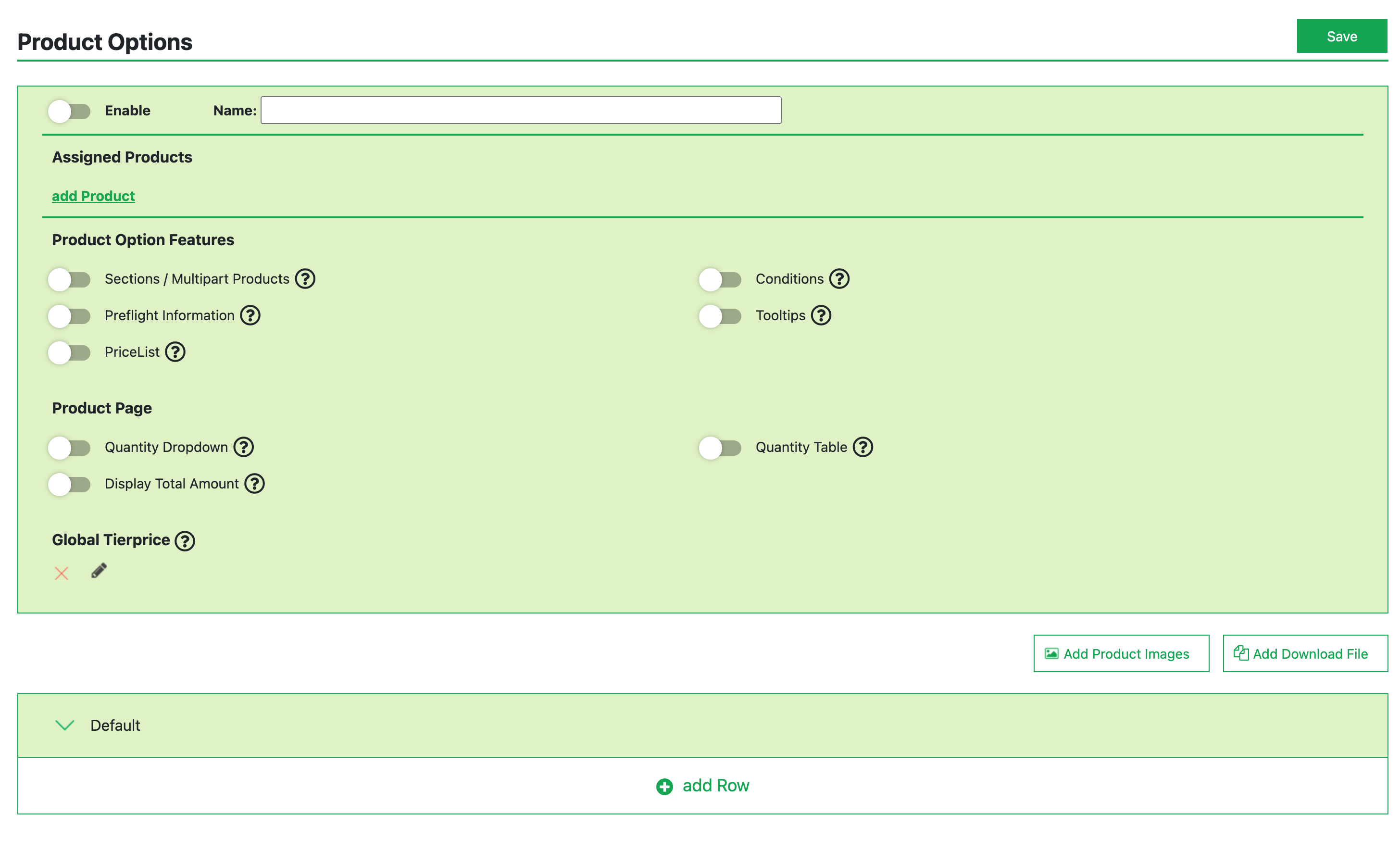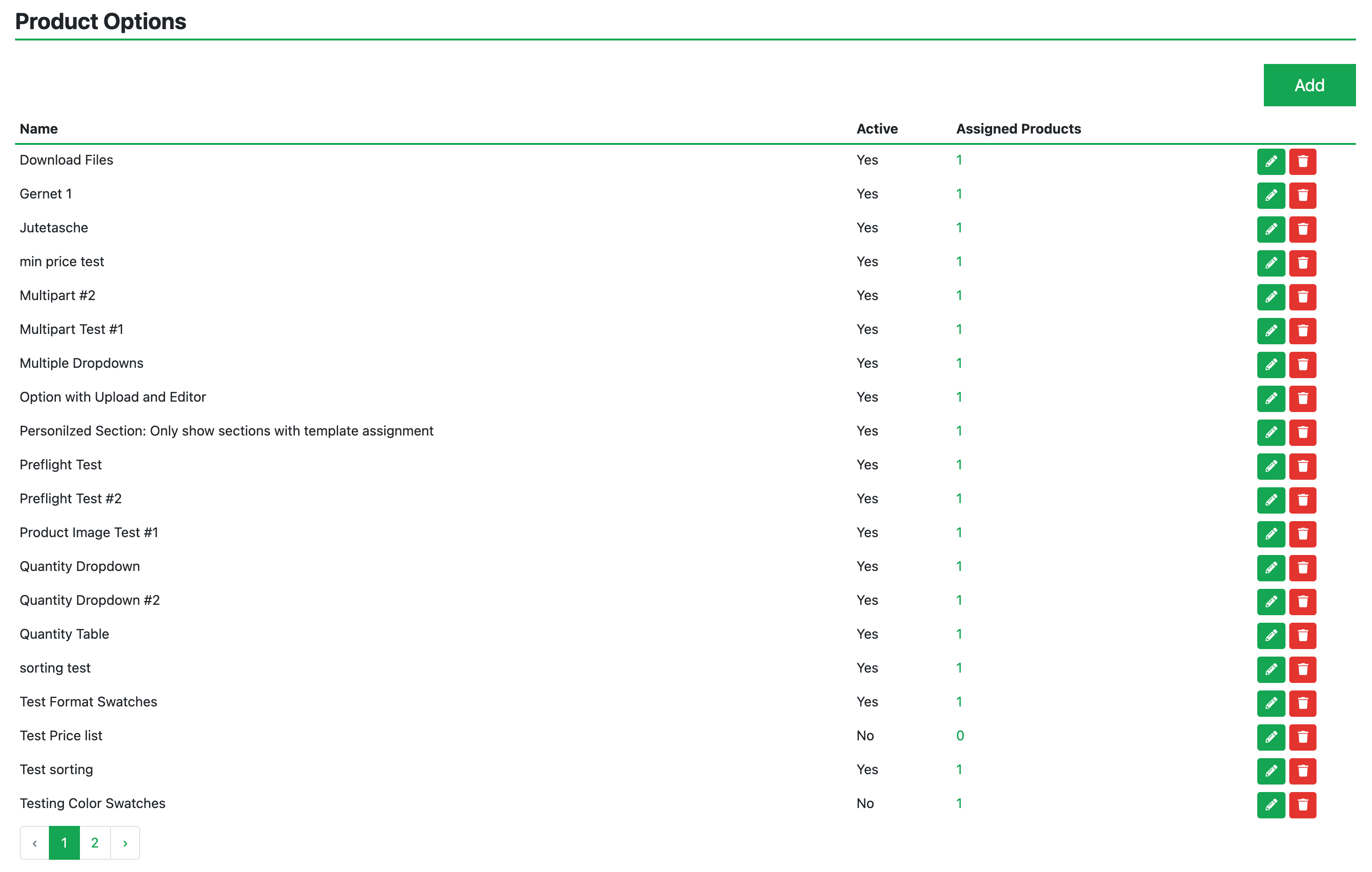 Mit einem klick auf “Add” lässt sich eine neue Produktoption hinzufügen.