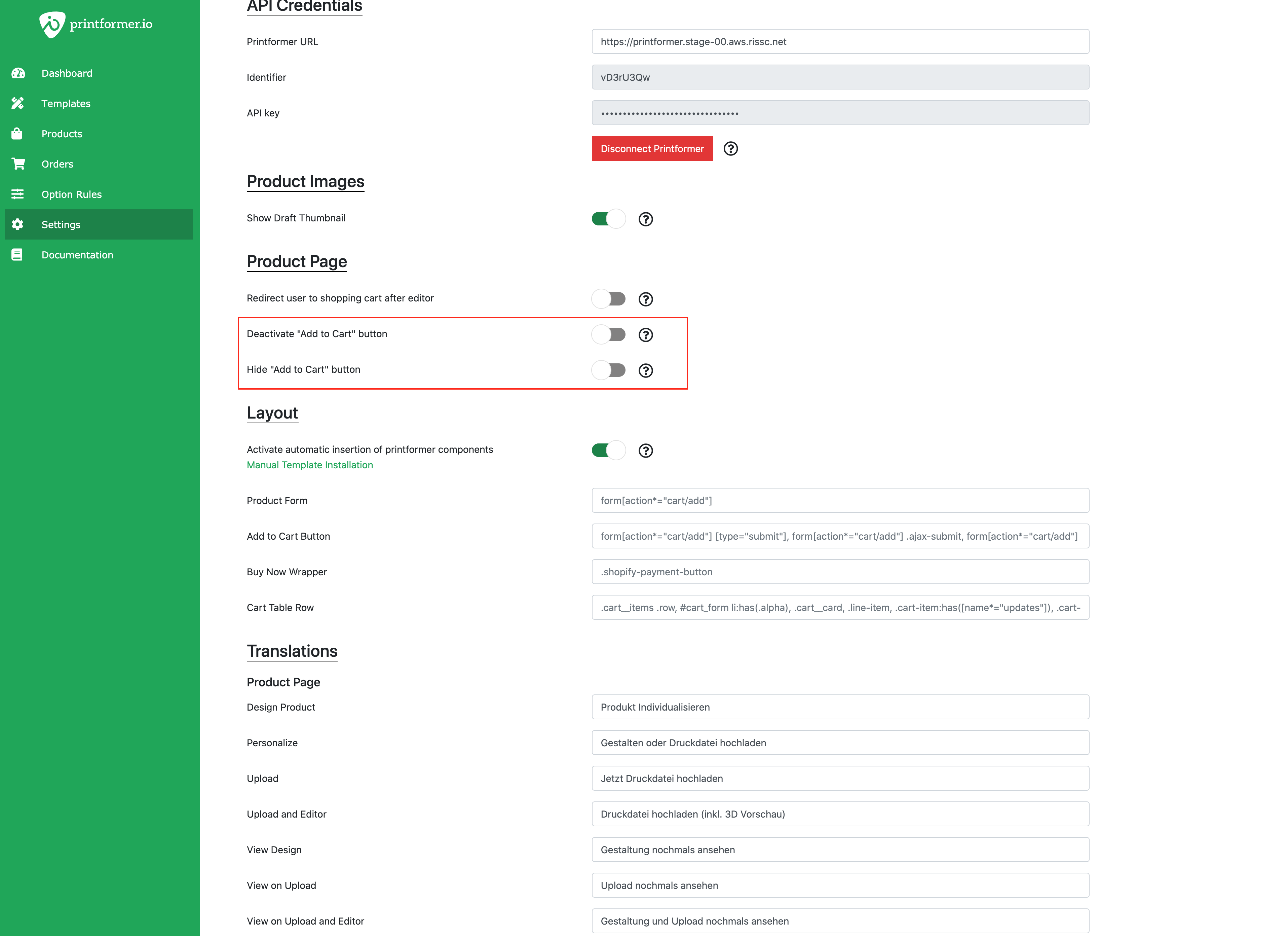 Add reset button to disconnet existing printformer connections between Shopify and printformer