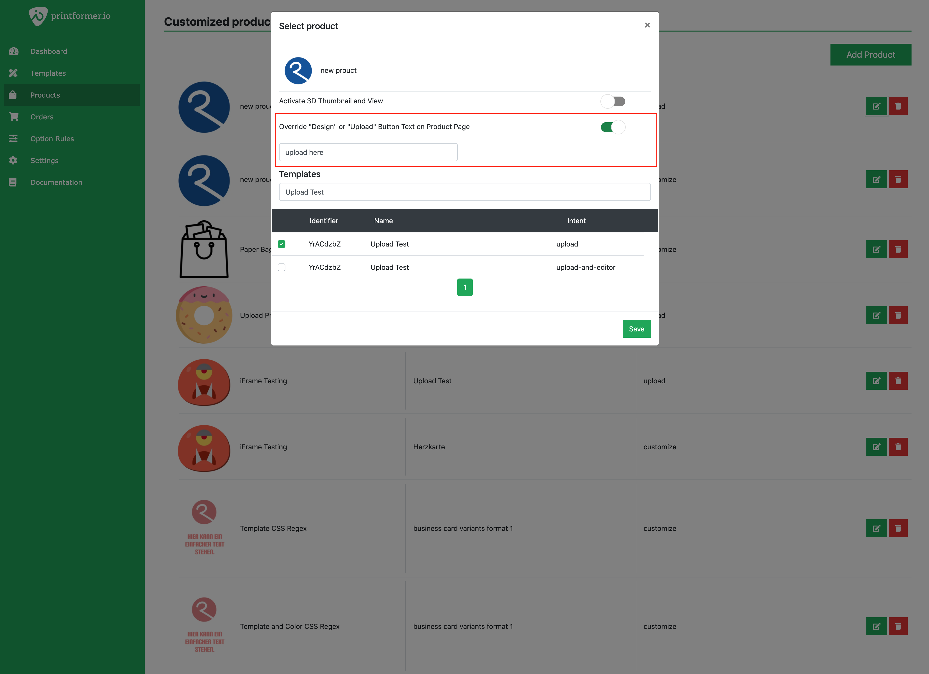 Override Design/Upload Button Label for specific products and edit available Product settings without delete the Templates → Product relation