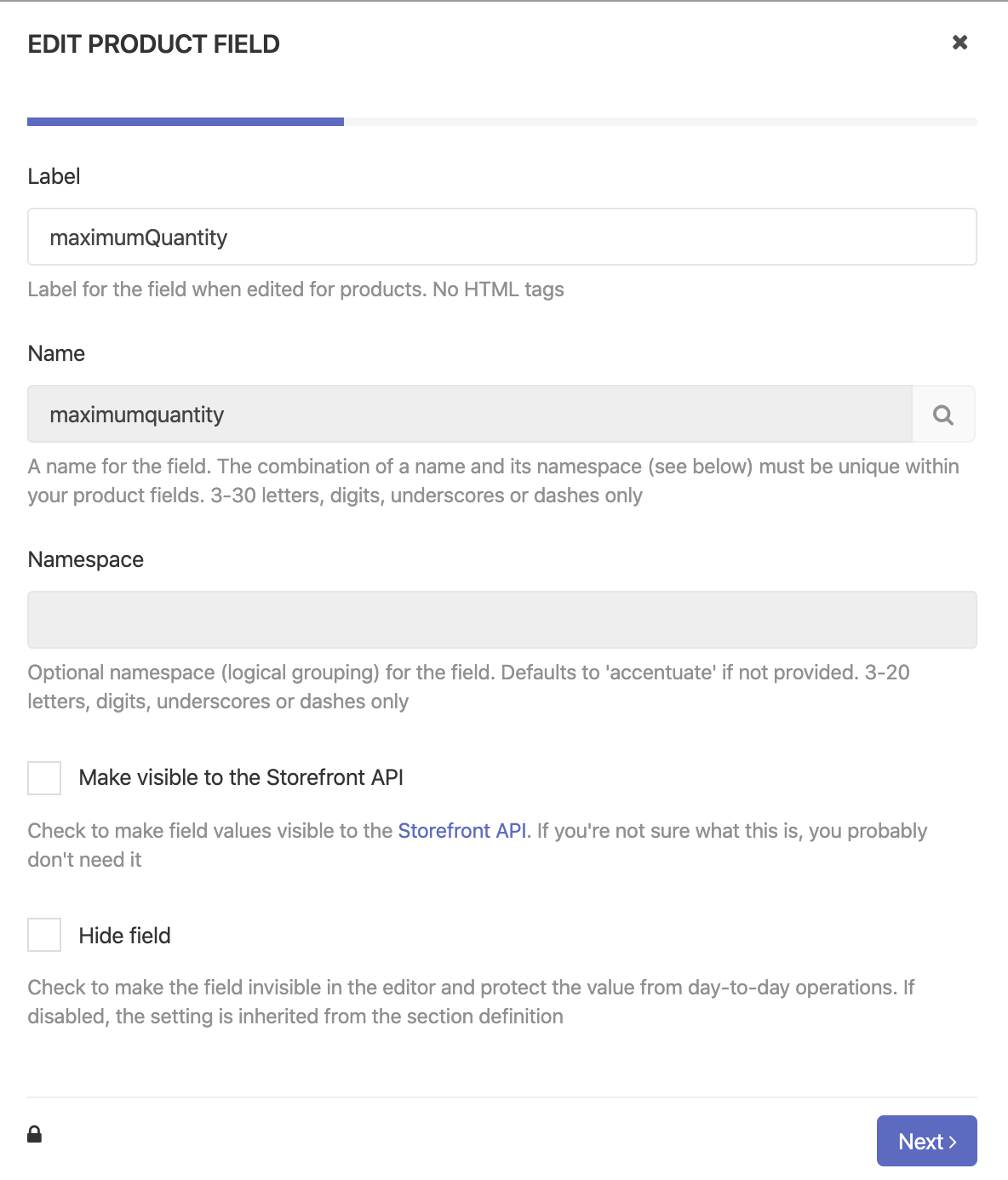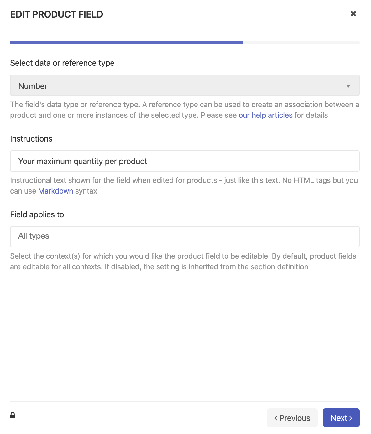 Create two new Product Metafields to store information about your maximum quantity and quantity steps per product: